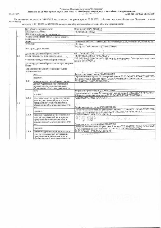 Данные получены с сайта ГИС Торги. Должник: Толмачева Н.В., собственник: Толмачева Н.В. Лот: Нежилое помещение (гараж), площадь 19,1 кв.м., кадастровый номер: 72:23:0430001:10368, г. Тюмень, ул. 30 лет Победы, д. 38, стр. 14, гараж 51, н/ц: 673400 р., з-к: 101010 р., код: 0001, рег. 72-011184