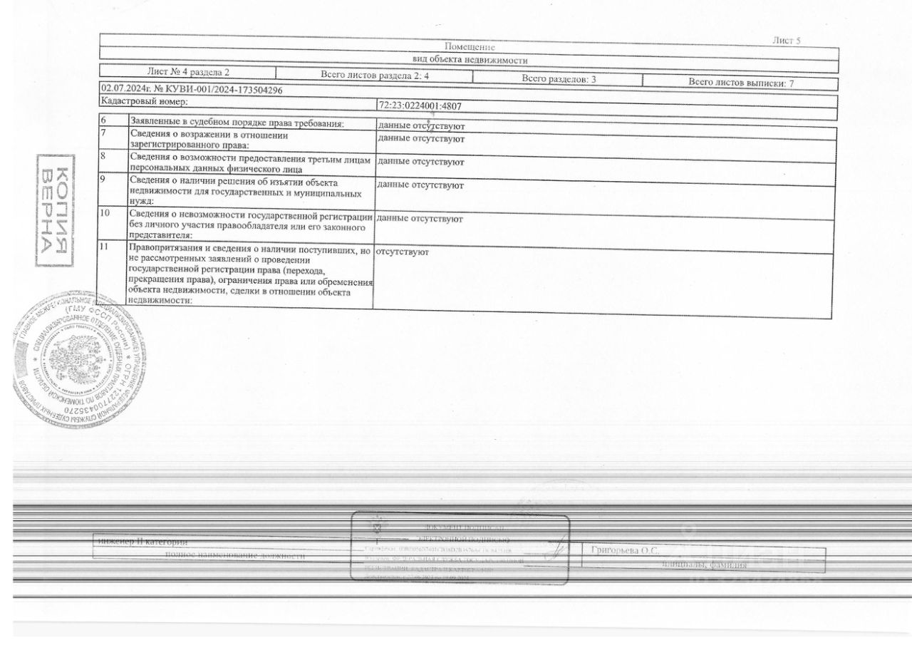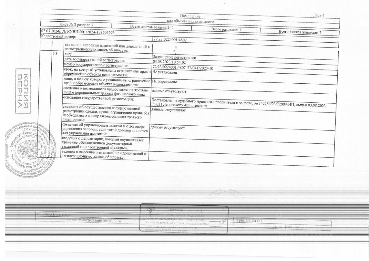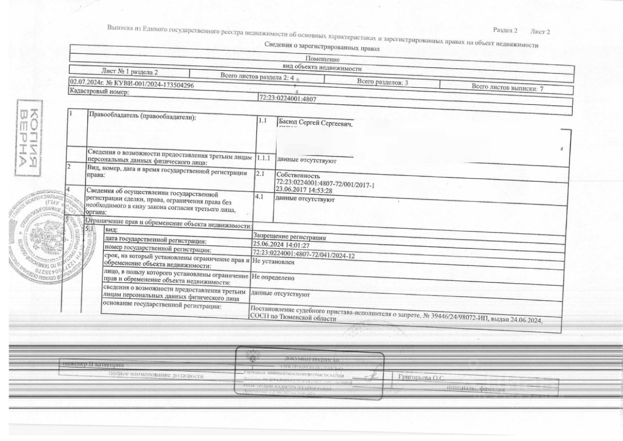 Данные получены с сайта ГИС Торги. Должник: Басюл С.С., собственник: Басюл С.С. Лот: Нежилое помещение, площадь 4 кв. м., кадастровый номер: 72:23:0224001:4807, г. Тюмень, ул. Беловежская, 7, корп.2, н/ц: 185130 р., з-к: 27770 р, код: 0001, рег. 72-010393-ГМУ