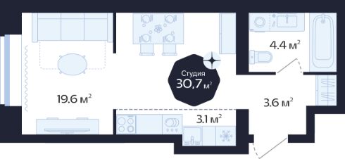Вместительная студия с большой ванной комнатой и прихожей. В комнате предусмотрено грамотное зонирование на нишу и обеденную зону, а также на гостевую, которая легко трансформируется в спальню.
