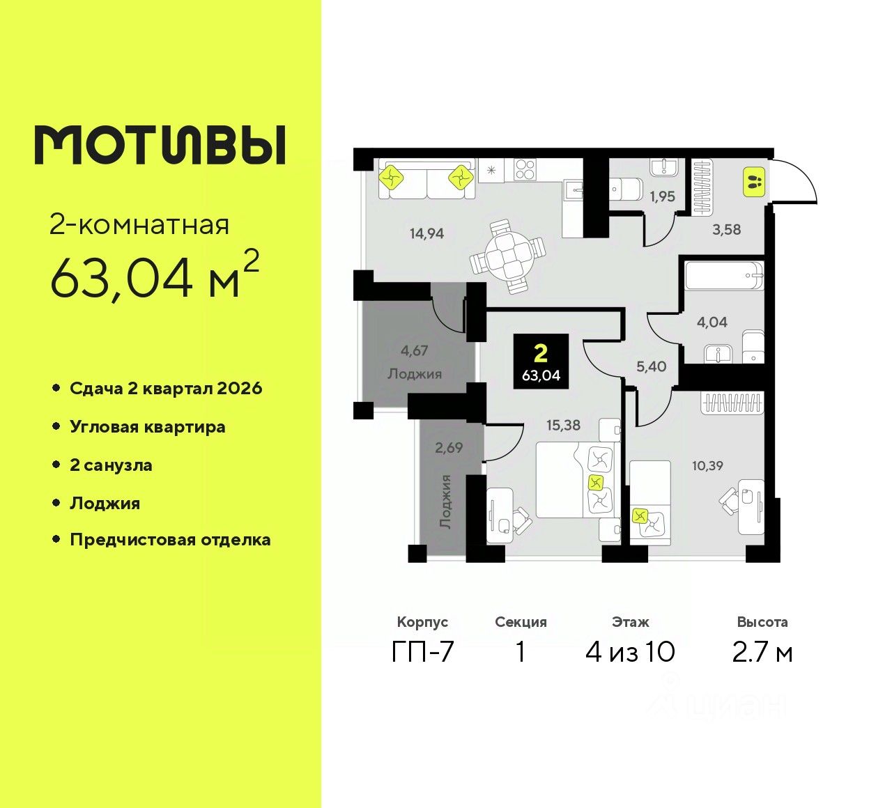 Продается 2-комн. квартира с предчистовой отделкой в ЖК ''Мотивы'' на 4 этаже. Общая площадь: 63.04 кв.м., жилая: 25.77 кв.м., площадь просторной кухни-столовой: 14.94 кв.м. Квартира угловая, идеально подойдет любителям тишины и панорамных видов. В квартире две лоджии, один совмещенный и один раздельный санузел. Высота потолков 2.7 м. Квартира будет сдаваться с предчистовой отделкой White Box: выровнены и оштукатурены стены, проведено электричество и отопление, установлены радиаторы. Вы также можете приобрести квартиру с ремонтом от застройщика, представленным в трех цветовых решениях Scandi, Wood и Coffee и включающим ламинат, обои под покраску, двери, натяжной потолок и санузел с сантехникой. При желании вы можете заказать отделку под ключ, варианты возможных решений представлены в альбоме фотографий. Дом монолитный, трехподъездный, высотой 10 этажей. Квартира находится в 1-й секции в корпусе ГП-7. На этаже 5 квартир. В подъезде 1 пассажирский и 1 грузовой лифт. Окончание строительства - 2 квартал 2026 года. Оформление сделки по договору долевого участия. Закрытая от автомобилей территория, безопасный двор и камеры видеонаблюдения - гаранты вашего спокойствия. Квартал будет располагать богатой инфраструктурой: на первых этажах разместятся магазины, пекарни, кофейни, пункты выдачи, аптеки, детские центры, цветочные салоны и многое другое, что сделает жизнь поистине комфортной. Рядом находится парк общей площадью почти 5000 м², в котором располагаются локации для игр и отдыха жителей, здесь можно совершить утреннюю пробежку или прогуляться после рабочего дня. В парке есть зона воркаута с тренажерами для взрослых, игровые комплексы с горками и канатный комплекс для детей разных возрастов, качели и лавочки для отдыха, площадки для командных видов спорта и для панна-футбола. В ЖК ''Мотивы'' всё продумано до мелочей: светлые холлы входных групп, оформленные в едином стиле, просторные колясочные, лапомойки для питомцев. На территории комплекса находятся 2 8-ми этажных паркинга и более 1000 м/м на открытой парковке. Жилой комплекс находится в одном из экологически благоприятных районов Тюмени, недалеко от Плехановского бора. При этом до центра города можно добраться за 15 минут, а до международного аэропорта Рощино за 13 минут. Окончание строительства: ГП 1, 2, 3, 4 сдача до конца 2024 года, ГП 6, 7, 8 сдача 2 квартал 2026 года. #2wDdbF