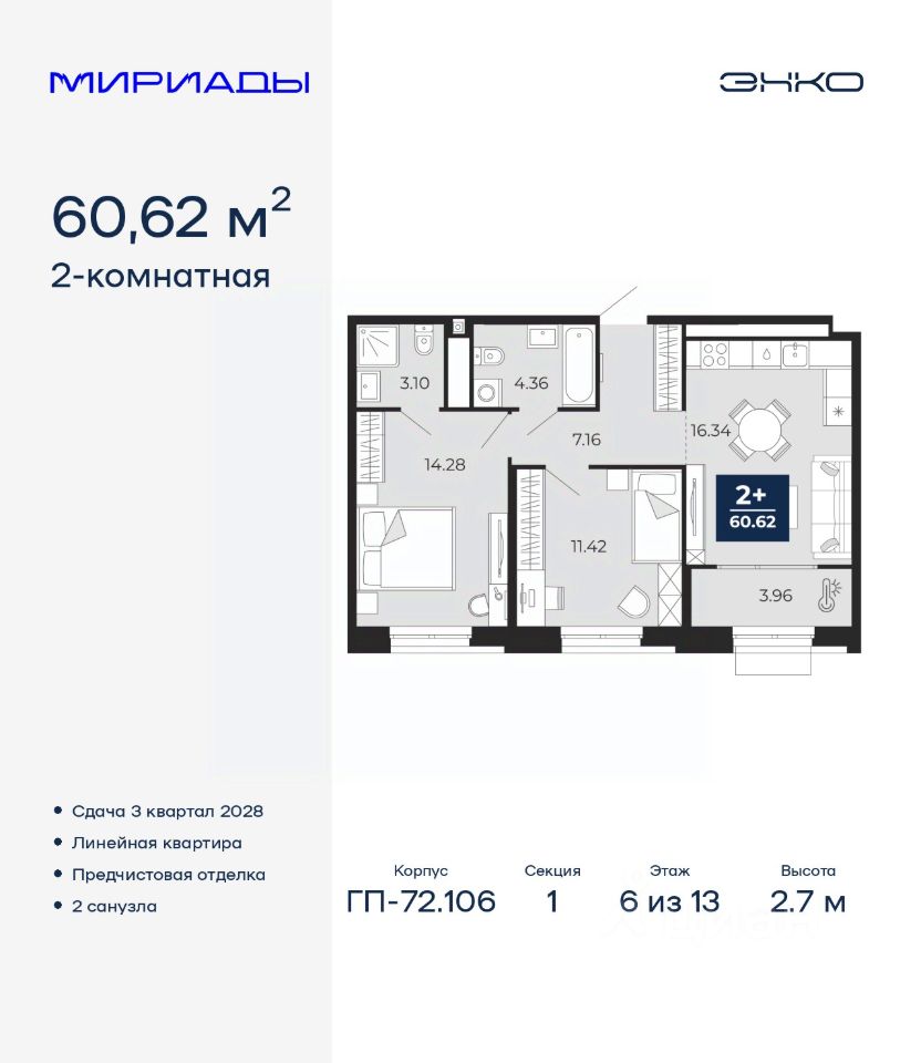 Спешите забронировать на этих условиях! Период предложения ограничен! Стоимость квартиры указана со скидкой, ваша экономия составит 411,500 RUB. Звоните, наши менеджеры вам все расскажут! Просторная 2-комн. квартира с предчистовой отделкой в ЖК ''Мириады'' на 13 этаже. Общая площадь: 60.58 кв.м., жилая: 26.9 кв.м., площадь просторной кухни-столовой: 18.07 кв.м. Комнаты изолированные, все окна выходят на одну сторону. В квартире один балкон, два совмещенных санузла. Высота потолков 2.7 м. Дом монолитный, двухподъездный, переменной этажности, от 14 до 16 этажей. Квартира находится во 2-й секции высотой 16 этажей в корпусе ГП-72.107. На этаже 10 квартир. В подъезде 1 пассажирский и 1 грузовой лифт. Окончание строительства - 3 квартал 2028 года. Оформление сделки по договору долевого участия. Вселенная бесконечных историй. Ранее невиданный Тюмени масштаб: территория 240 гектаров и 1 650 000 м² застройки. Мириады это город масштабных перемен и больших возможностей. Город зеленых рощ и зеркальных озер. Город для работы, учебы и развлечений. Город для детей и их родителей. Город для всех и каждого. Проект расположен в районе Мыс рядом с ТРЦ ''Тюмень Сити Молл'' в границах улицы Тимофея Чаркова, Тобольского тракта и объездной дороги. Срок полного освоения территории - до 2034 года. #z6dAWu