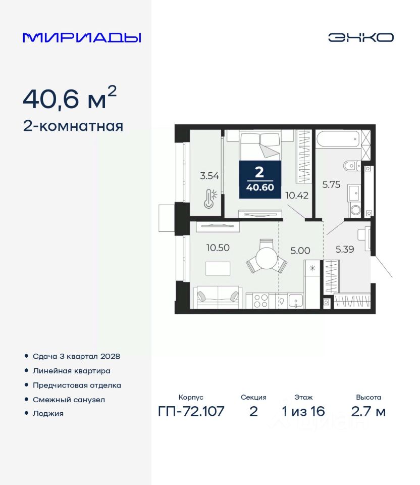 Спешите забронировать по этой цене! Предложение ограничено! Стоимость квартиры указана со скидкой, ваша экономия составит 315,000 RUB. Информация по телефону, мы вам все подробно расскажем! Просторная двухкомнатная квартира с европланировкой и предчистовой отделкой в ЖК ''Мириады'' на 1 этаже. Общая площадь: 40.6 кв.м., жилая: 20.92 кв.м., общая площадь гостиной-столовой с кухонной зоной: 15.5 кв.м. Европланировка, за счет большой площади кухни-гостиной квартира выглядит просторной и очень удобна для жизни. Комнаты изолированные, все окна выходят на одну сторону. В квартире одна лоджия, один совмещенный санузел. Высота потолков 2.7 м. Дом монолитный, двухподъездный, переменной этажности, от 14 до 16 этажей. Квартира находится во 2-й секции высотой 16 этажей в корпусе ГП-72.107. На этаже 10 квартир. В подъезде 1 пассажирский и 1 грузовой лифт. Окончание строительства - 3 квартал 2028 года. Оформление сделки по договору долевого участия. Вселенная бесконечных историй. Ранее невиданный Тюмени масштаб: территория 240 гектаров и 1 650 000 м² застройки. Мириады это город масштабных перемен и больших возможностей. Город зеленых рощ и зеркальных озер. Город для работы, учебы и развлечений. Город для детей и их родителей. Город для всех и каждого. Проект расположен в районе Мыс рядом с ТРЦ ''Тюмень Сити Молл'' в границах улицы Тимофея Чаркова, Тобольского тракта и объездной дороги. Срок полного освоения территории - до 2034 года. #zmD9E9