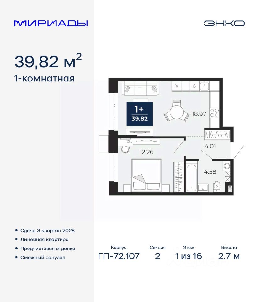 Спешите оформить бронирование по акционной цене! Предложение ограничено! Стоимость квартиры указана со скидкой, ваша экономия составит 319,500 RUB. Информация по телефону, наши менеджеры вам все расскажут! Продается однокомнатная квартира с предчистовой отделкой в ЖК ''Мириады'' на 1 этаже. Общая площадь: 39.82 кв.м., жилая: 12.26 кв.м., площадь просторной кухни-столовой: 18.97 кв.м. Все окна выходят на одну сторону. В квартире один совмещенный санузел. Высота потолков 2.7 м. Дом монолитный, двухподъездный, переменной этажности, от 14 до 16 этажей. Квартира находится во 2-й секции высотой 16 этажей в корпусе ГП-72.107. На этаже 10 квартир. В подъезде 1 пассажирский и 1 грузовой лифт. Окончание строительства - 3 квартал 2028 года. Оформление сделки по договору долевого участия. Вселенная бесконечных историй. Ранее невиданный Тюмени масштаб: территория 240 гектаров и 1 650 000 м² застройки. Мириады это город масштабных перемен и больших возможностей. Город зеленых рощ и зеркальных озер. Город для работы, учебы и развлечений. Город для детей и их родителей. Город для всех и каждого. Проект расположен в районе Мыс рядом с ТРЦ ''Тюмень Сити Молл'' в границах улицы Тимофея Чаркова, Тобольского тракта и объездной дороги. Срок полного освоения территории - до 2034 года. #26D9ED