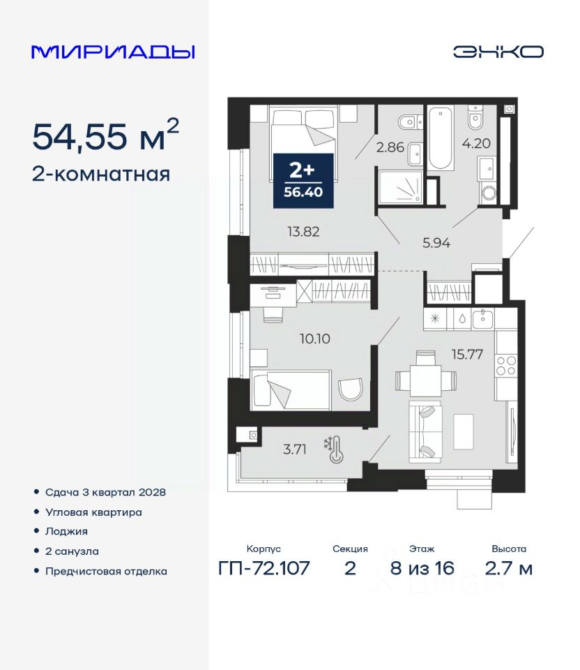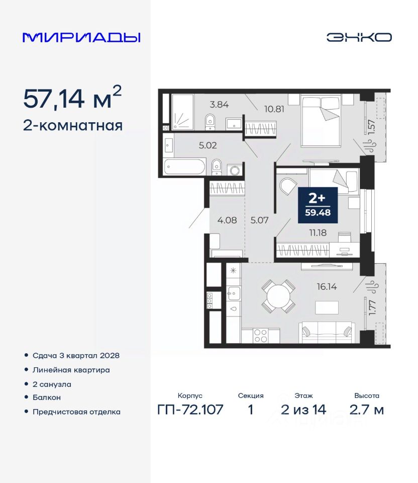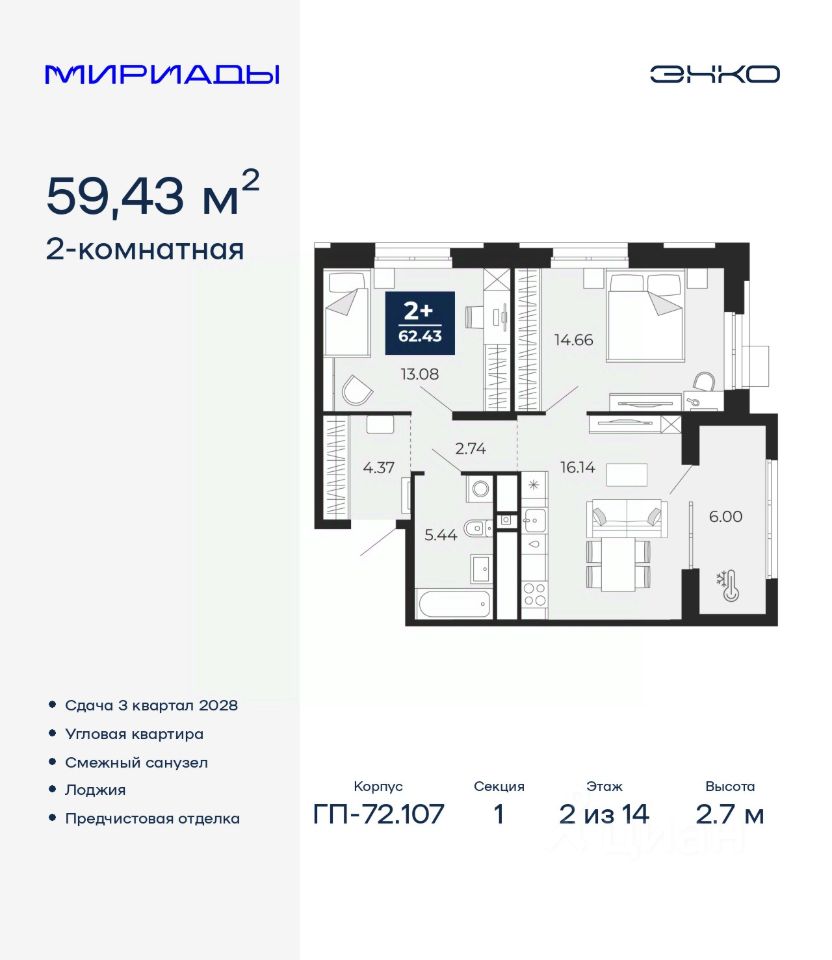 Торопитесь забронировать по акционной цене! Период акции ограничен! Стоимость квартиры указана со скидкой, ваша экономия составит 395,500 RUB. Информация по телефону, наши менеджеры вам все расскажут! Двухкомнатная квартира с предчистовой отделкой в ЖК ''Мириады'' на 2 этаже. Общая площадь: 59.43 кв.м., жилая: 27.74 кв.м., площадь просторной кухни-столовой: 16.14 кв.м. Угловая квартира, очень светлая, естественная вентиляция при открытии окон. В квартире одна лоджия, один совмещенный санузел. Высота потолков 2.7 м. Дом монолитный, двухподъездный, переменной этажности, от 14 до 16 этажей. Квартира находится в 1-й секции высотой 14 этажей в корпусе ГП-72.107. На этаже 5 квартир. В подъезде 1 пассажирский и 1 грузовой лифт. Окончание строительства - 3 квартал 2028 года. Оформление сделки по договору долевого участия. Вселенная бесконечных историй. Ранее невиданный Тюмени масштаб: территория 240 гектаров и 1 650 000 м² застройки. Мириады это город масштабных перемен и больших возможностей. Город зеленых рощ и зеркальных озер. Город для работы, учебы и развлечений. Город для детей и их родителей. Город для всех и каждого. Проект расположен в районе Мыс рядом с ТРЦ ''Тюмень Сити Молл'' в границах улицы Тимофея Чаркова, Тобольского тракта и объездной дороги. Срок полного освоения территории - до 2034 года. #ZmDau3