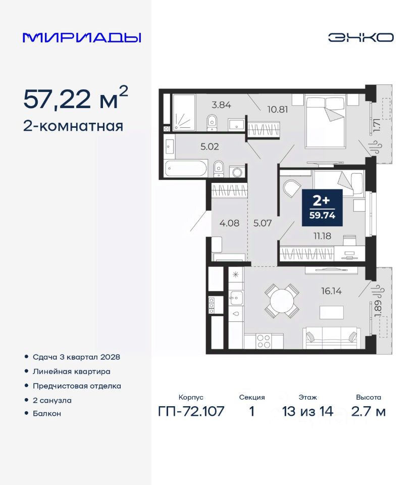 Торопитесь забронировать на этих условиях! Предложение ограничено! Стоимость квартиры указана со скидкой, ваша экономия составит 392,000 RUB. Информация по телефону, мы вам все подробно расскажем! Продается двухкомнатная квартира с предчистовой отделкой в ЖК ''Мириады'' на 13 этаже. Общая площадь: 57.22 кв.м., жилая: 21.99 кв.м., площадь просторной кухни-столовой: 16.14 кв.м. Комнаты изолированные, все окна выходят на одну сторону. В квартире два балкона, два совмещенных санузла. Высота потолков 2.7 м. Дом монолитный, двухподъездный, переменной этажности, от 14 до 16 этажей. Квартира находится в 1-й секции высотой 14 этажей в корпусе ГП-72.107. На этаже 5 квартир. В подъезде 1 пассажирский и 1 грузовой лифт. Окончание строительства - 3 квартал 2028 года. Оформление сделки по договору долевого участия. Вселенная бесконечных историй. Ранее невиданный Тюмени масштаб: территория 240 гектаров и 1 650 000 м² застройки. Мириады это город масштабных перемен и больших возможностей. Город зеленых рощ и зеркальных озер. Город для работы, учебы и развлечений. Город для детей и их родителей. Город для всех и каждого. Проект расположен в районе Мыс рядом с ТРЦ ''Тюмень Сити Молл'' в границах улицы Тимофея Чаркова, Тобольского тракта и объездной дороги. Срок полного освоения территории - до 2034 года. #ZMDAzF