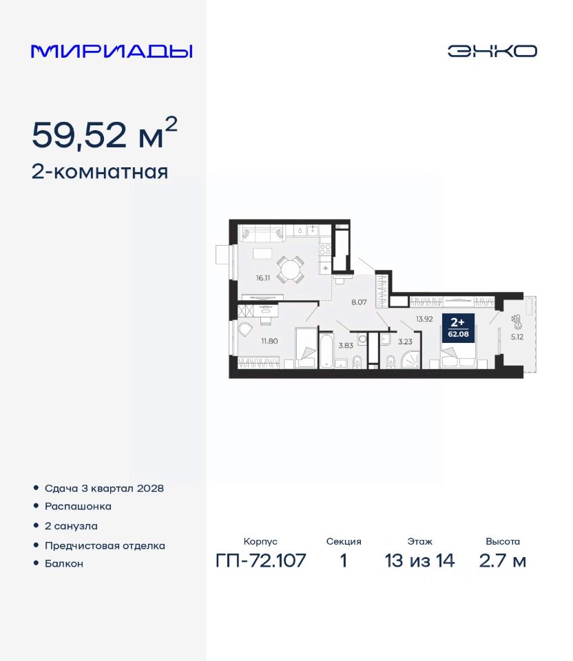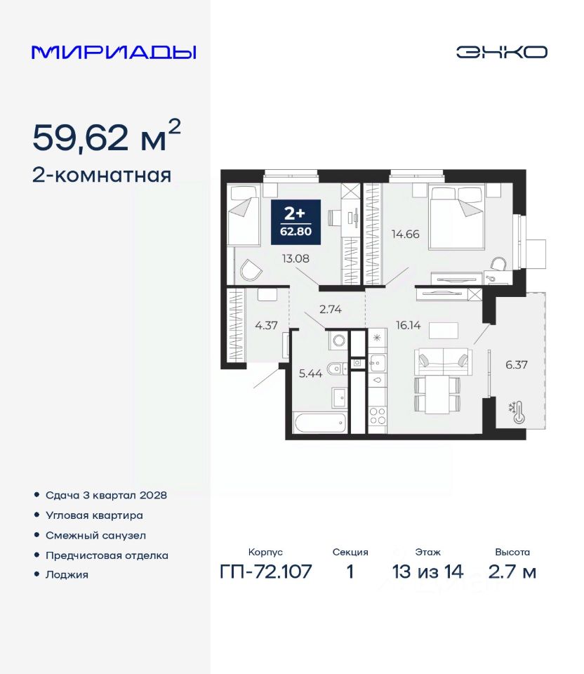Успейте забронировать по акционной цене! Предложение ограничено! Стоимость квартиры указана со скидкой, ваша экономия составит 404,500 RUB. По всем вопросам обращайтесь в офис продаж, наши менеджеры вам все расскажут! Просторная двухкомнатная квартира с предчистовой отделкой в ЖК ''Мириады'' на 13 этаже. Общая площадь: 59.62 кв.м., жилая: 27.74 кв.м., площадь просторной кухни-столовой: 16.14 кв.м. Квартира угловая, идеально подойдет любителям тишины и панорамных видов. В квартире одна лоджия, один совмещенный санузел. Высота потолков 2.7 м. Дом монолитный, двухподъездный, переменной этажности, от 14 до 16 этажей. Квартира находится в 1-й секции высотой 14 этажей в корпусе ГП-72.107. На этаже 5 квартир. В подъезде 1 пассажирский и 1 грузовой лифт. Окончание строительства - 3 квартал 2028 года. Оформление сделки по договору долевого участия. Вселенная бесконечных историй. Ранее невиданный Тюмени масштаб: территория 240 гектаров и 1 650 000 м² застройки. Мириады это город масштабных перемен и больших возможностей. Город зеленых рощ и зеркальных озер. Город для работы, учебы и развлечений. Город для детей и их родителей. Город для всех и каждого. Проект расположен в районе Мыс рядом с ТРЦ ''Тюмень Сити Молл'' в границах улицы Тимофея Чаркова, Тобольского тракта и объездной дороги. Срок полного освоения территории - до 2034 года. #ZmDaUd