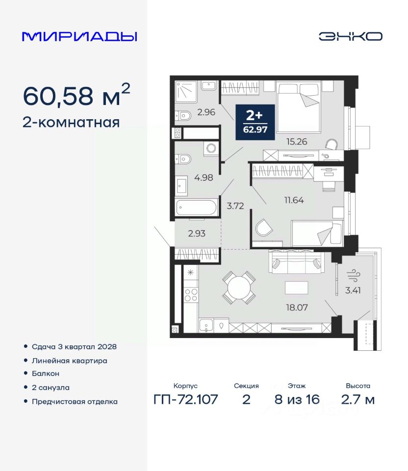 Успейте оформить бронирование по этой цене! Срок акции ограничен! Стоимость квартиры указана со скидкой, ваша экономия составит 410,000 RUB. Информация по телефону, мы вам все подробно расскажем! 2-комн. квартира от застройщика с предчистовой отделкой в ЖК ''Мириады'' на 8 этаже. Общая площадь: 60.58 кв.м., жилая: 26.9 кв.м., площадь просторной кухни-столовой: 18.07 кв.м. Комнаты изолированные, все окна выходят на одну сторону. В квартире один балкон, два совмещенных санузла. Высота потолков 2.7 м. Дом монолитный, двухподъездный, переменной этажности, от 14 до 16 этажей. Квартира находится во 2-й секции высотой 16 этажей в корпусе ГП-72.107. На этаже 10 квартир. В подъезде 1 пассажирский и 1 грузовой лифт. Окончание строительства - 3 квартал 2028 года. Оформление сделки по договору долевого участия. Вселенная бесконечных историй. Ранее невиданный Тюмени масштаб: территория 240 гектаров и 1 650 000 м² застройки. Мириады это город масштабных перемен и больших возможностей. Город зеленых рощ и зеркальных озер. Город для работы, учебы и развлечений. Город для детей и их родителей. Город для всех и каждого. Проект расположен в районе Мыс рядом с ТРЦ ''Тюмень Сити Молл'' в границах улицы Тимофея Чаркова, Тобольского тракта и объездной дороги. Срок полного освоения территории - до 2034 года. #z6dAWz
