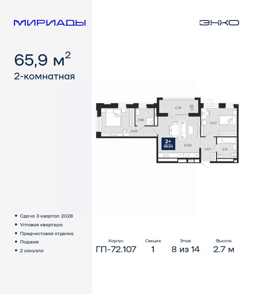 Спешите забронировать по этой цене! Срок предложения ограничен! Стоимость квартиры указана со скидкой, ваша экономия составит 437,000 RUB. По всем вопросам звоните в офис продаж, мы вам все подробно расскажем! Продается 2-комн. квартира с предчистовой отделкой в ЖК ''Мириады'' на 8 этаже. Общая площадь: 65.9 кв.м., жилая: 27.32 кв.м., площадь просторной кухни-столовой: 21.69 кв.м. Квартира угловая, идеально подойдет любителям тишины и панорамных видов. В квартире одна лоджия, два совмещенных санузла. Высота потолков 2.7 м. Дом монолитный, двухподъездный, переменной этажности, от 14 до 16 этажей. Квартира находится в 1-й секции высотой 14 этажей в корпусе ГП-72.107. На этаже 5 квартир. В подъезде 1 пассажирский и 1 грузовой лифт. Окончание строительства - 3 квартал 2028 года. Оформление сделки по договору долевого участия. Вселенная бесконечных историй. Ранее невиданный Тюмени масштаб: территория 240 гектаров и 1 650 000 м² застройки. Мириады это город масштабных перемен и больших возможностей. Город зеленых рощ и зеркальных озер. Город для работы, учебы и развлечений. Город для детей и их родителей. Город для всех и каждого. Проект расположен в районе Мыс рядом с ТРЦ ''Тюмень Сити Молл'' в границах улицы Тимофея Чаркова, Тобольского тракта и объездной дороги. Срок полного освоения территории - до 2034 года. #Z6dA4v