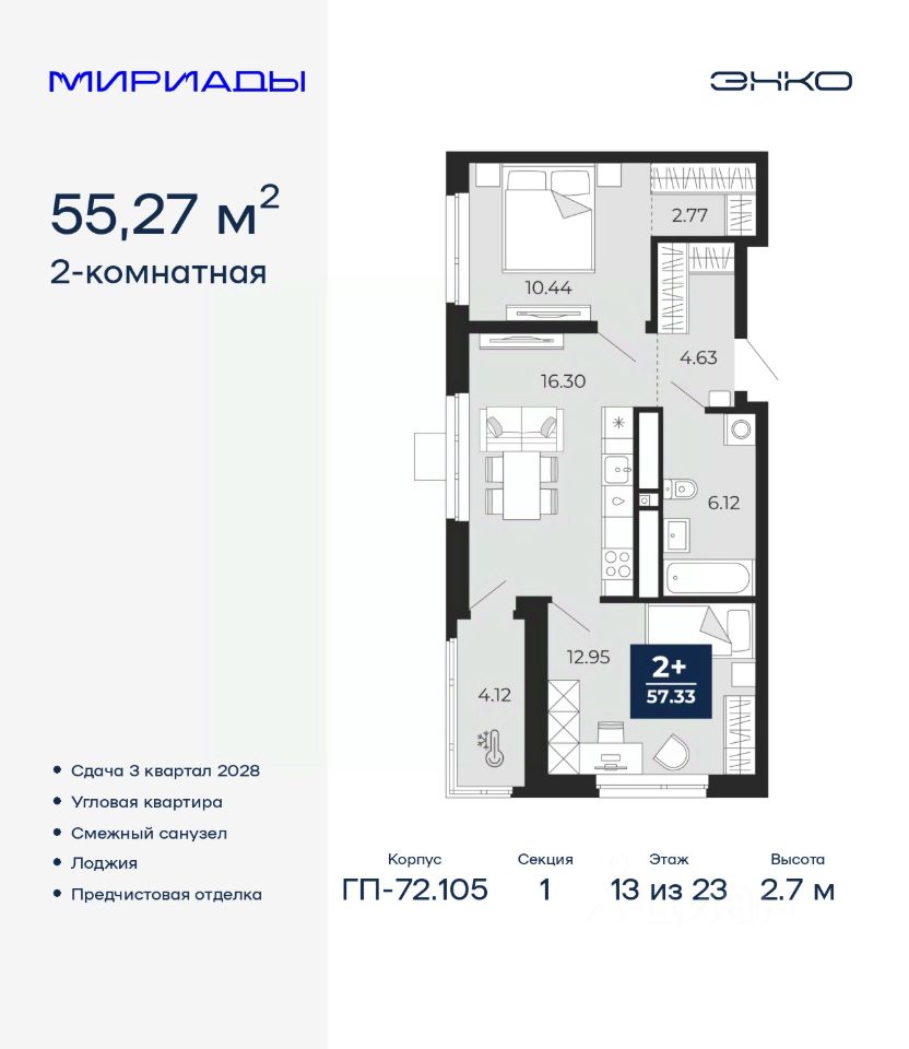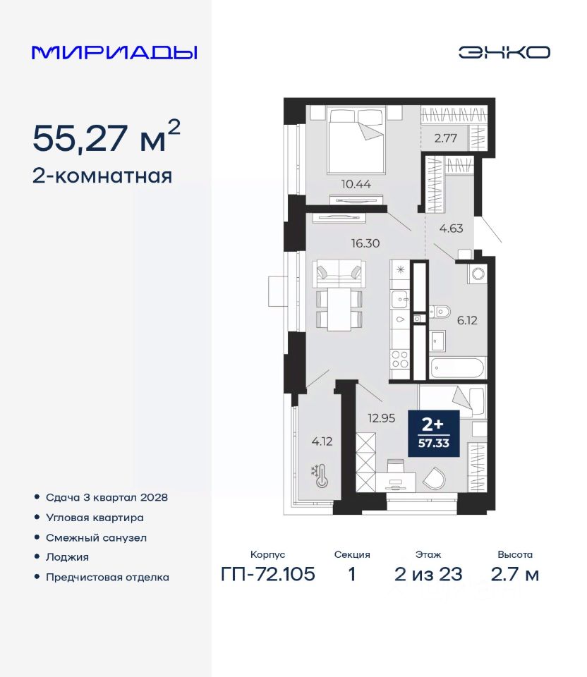 Спешите оформить бронирование, пока действует скидка! Предложение ограничено! Стоимость квартиры указана со скидкой, ваша экономия составит 387,500 RUB. Информация по телефону, мы вам все подробно расскажем! Просторная 2-комн. квартира с предчистовой отделкой в ЖК ''Мириады'' на 2 этаже. Общая площадь: 55.27 кв.м., жилая: 23.39 кв.м., площадь просторной кухни-столовой: 16.3 кв.м. Квартира угловая, идеально подойдет любителям тишины и панорамных видов. В квартире одна лоджия, один совмещенный санузел. Высота потолков 2.7 м. Квартира находится в корпусе ГП-72.105. Дом монолитный, одноподъездный, высотой 23 этажа. На этаже 8 квартир. В подъезде 2 пассажирских и 1 грузовой лифт. Начало строительства - 1 квартал 2026 года. Окончание строительства - 3 квартал 2028 года. Оформление сделки по договору долевого участия. Вселенная бесконечных историй. Ранее невиданный Тюмени масштаб: территория 240 гектаров и 1 650 000 м² застройки. Мириады это город масштабных перемен и больших возможностей. Город зеленых рощ и зеркальных озер. Город для работы, учебы и развлечений. Город для детей и их родителей. Город для всех и каждого. Проект расположен в районе Мыс рядом с ТРЦ ''Тюмень Сити Молл'' в границах улицы Тимофея Чаркова, Тобольского тракта и объездной дороги. Срок полного освоения территории - до 2034 года. #2MDAZA