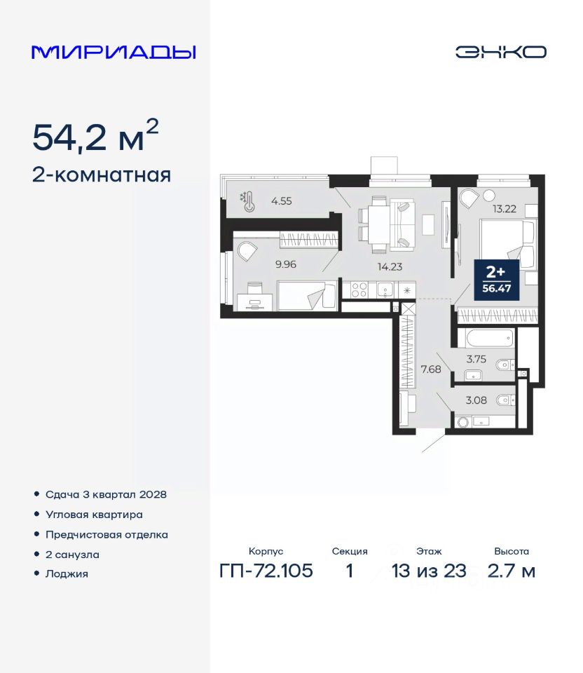 54 м² · Этаж 13 из 23