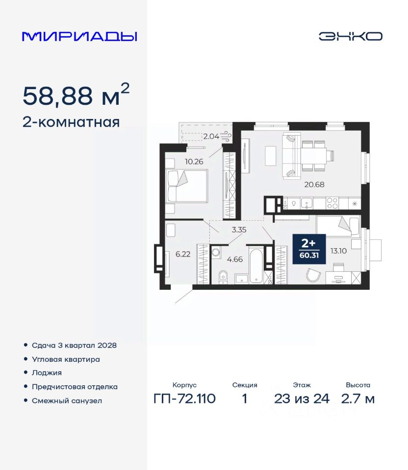 Успейте оформить бронирование на этих условиях! Период акции ограничен! Стоимость квартиры указана со скидкой, ваша экономия составит 399,000 RUB. Информация по телефону, наши менеджеры вам все расскажут! 2-комн. квартира с предчистовой отделкой в ЖК ''Мириады'' на 23 этаже. Общая площадь: 58.88 кв.м., жилая: 23.36 кв.м., площадь просторной кухни-столовой: 20.68 кв.м. Квартира угловая, окна oбecпeчивaют paвнoмepнoe ocвeщeниe в тeчeниe дня. В квартире одна лоджия, один совмещенный санузел. Высота потолков 2.7 м. Квартира находится в корпусе ГП-72.110. Дом монолитный, одноподъездный, высотой 24 этажа. На этаже 8 квартир. В подъезде 2 пассажирских и 1 грузовой лифт. Начало строительства - 1 квартал 2026 года. Окончание строительства - 3 квартал 2028 года. Оформление сделки по договору долевого участия. Вселенная бесконечных историй. Ранее невиданный Тюмени масштаб: территория 240 гектаров и 1 650 000 м² застройки. Мириады это город масштабных перемен и больших возможностей. Город зеленых рощ и зеркальных озер. Город для работы, учебы и развлечений. Город для детей и их родителей. Город для всех и каждого. Проект расположен в районе Мыс рядом с ТРЦ ''Тюмень Сити Молл'' в границах улицы Тимофея Чаркова, Тобольского тракта и объездной дороги. Срок полного освоения территории - до 2034 года. #2MDaUs