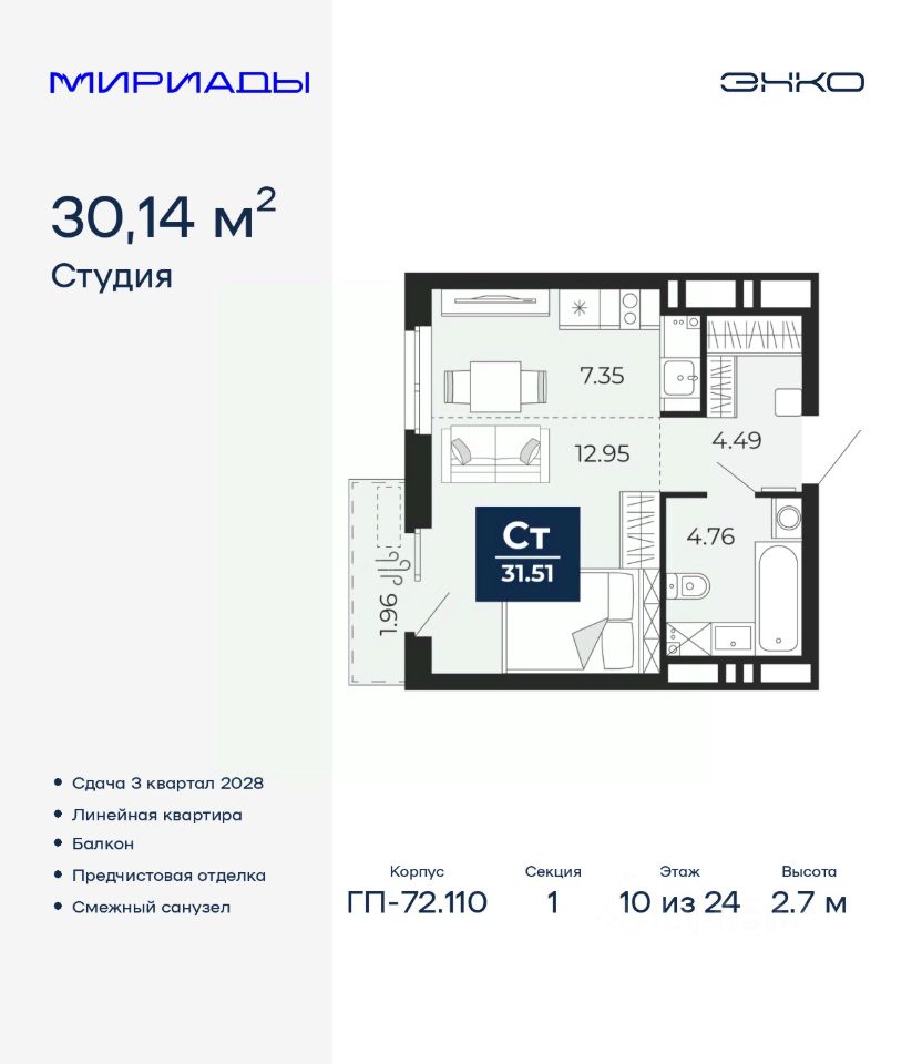Торопитесь забронировать на этих условиях! Период предложения ограничен! Стоимость квартиры указана со скидкой, ваша экономия составит 275,000 RUB. Звоните, мы вам все подробно расскажем! Продается однокомнатная квартира-студия от застройщика с предчистовой отделкой в ЖК ''Мириады'' на 10 этаже. Общая площадь: 30.14 кв.м., площадь гостиной 20.3 кв.м., из которых 7.35 кв.м. выделено под кухонную зону. Все окна выходят на одну сторону. В квартире один балкон, один совмещенный санузел. Высота потолков 2.7 м. Квартира находится в корпусе ГП-72.110. Дом монолитный, одноподъездный, высотой 24 этажа. На этаже 8 квартир. В подъезде 2 пассажирских и 1 грузовой лифт. Начало строительства - 1 квартал 2026 года. Окончание строительства - 3 квартал 2028 года. Оформление сделки по договору долевого участия. Вселенная бесконечных историй. Ранее невиданный Тюмени масштаб: территория 240 гектаров и 1 650 000 м² застройки. Мириады это город масштабных перемен и больших возможностей. Город зеленых рощ и зеркальных озер. Город для работы, учебы и развлечений. Город для детей и их родителей. Город для всех и каждого. Проект расположен в районе Мыс рядом с ТРЦ ''Тюмень Сити Молл'' в границах улицы Тимофея Чаркова, Тобольского тракта и объездной дороги. Срок полного освоения территории - до 2034 года. #2mDamF