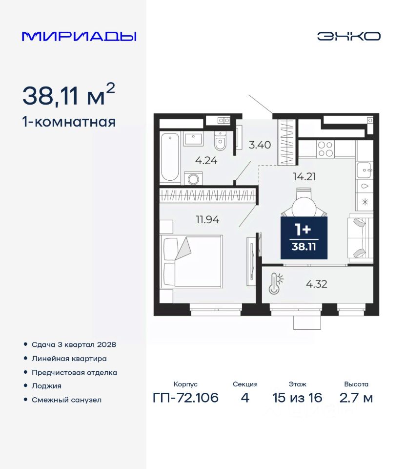 Спешите оформить бронирование по этой цене! Период акции ограничен! Стоимость квартиры указана со скидкой, ваша экономия составит 308,500 RUB. По всем вопросам обращайтесь в офис продаж, наши менеджеры вам все расскажут! Однокомнатная квартира от застройщика с предчистовой отделкой в ЖК ''Мириады'' на 11 этаже. Общая площадь: 38.11 кв.м., жилая: 11.94 кв.м., площадь просторной кухни-столовой: 14.21 кв.м. Все окна выходят на одну сторону. В квартире одна лоджия, один совмещенный санузел. Высота потолков 2.7 м. Дом монолитный, черырехподъездный, переменной этажности, от 13 до 16 этажей. Квартира находится в 4-й секции высотой 16 этажей в корпусе ГП-72.106. На этаже 6 квартир. В подъезде 1 пассажирский и 1 грузовой лифт. Окончание строительства - 3 квартал 2028 года. Оформление сделки по договору долевого участия. Вселенная бесконечных историй. Ранее невиданный Тюмени масштаб: территория 240 гектаров и 1 650 000 м² застройки. Мириады это город масштабных перемен и больших возможностей. Город зеленых рощ и зеркальных озер. Город для работы, учебы и развлечений. Город для детей и их родителей. Город для всех и каждого. Проект расположен в районе Мыс рядом с ТРЦ ''Тюмень Сити Молл'' в границах улицы Тимофея Чаркова, Тобольского тракта и объездной дороги. Срок полного освоения территории - до 2034 года. #26d9EO