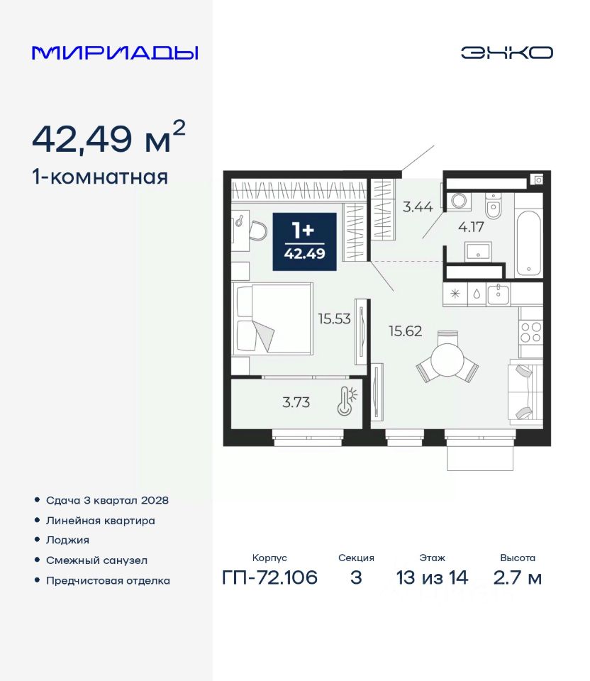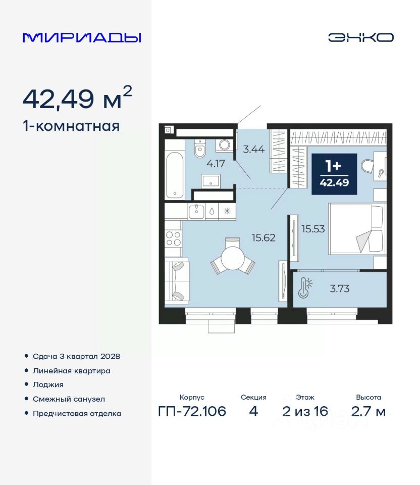 Торопитесь забронировать, пока действует скидка! Период акции ограничен! Стоимость квартиры указана со скидкой, ваша экономия составит 322,000 RUB. Звоните, мы вам все подробно расскажем! Просторная однокомнатная квартира с предчистовой отделкой в ЖК ''Мириады'' на 2 этаже. Общая площадь: 42.49 кв.м., жилая: 15.53 кв.м., площадь просторной кухни-столовой: 15.62 кв.м. Все окна выходят на одну сторону. В квартире одна лоджия, один совмещенный санузел. Высота потолков 2.7 м. Дом монолитный, черырехподъездный, переменной этажности, от 13 до 16 этажей. Квартира находится в 3-й секции высотой 14 этажей в корпусе ГП-72.106. На этаже 6 квартир. В подъезде 1 пассажирский и 1 грузовой лифт. Окончание строительства - 3 квартал 2028 года. Оформление сделки по договору долевого участия. Вселенная бесконечных историй. Ранее невиданный Тюмени масштаб: территория 240 гектаров и 1 650 000 м² застройки. Мириады это город масштабных перемен и больших возможностей. Город зеленых рощ и зеркальных озер. Город для работы, учебы и развлечений. Город для детей и их родителей. Город для всех и каждого. Проект расположен в районе Мыс рядом с ТРЦ ''Тюмень Сити Молл'' в границах улицы Тимофея Чаркова, Тобольского тракта и объездной дороги. Срок полного освоения территории - до 2034 года. #Z6d9EF