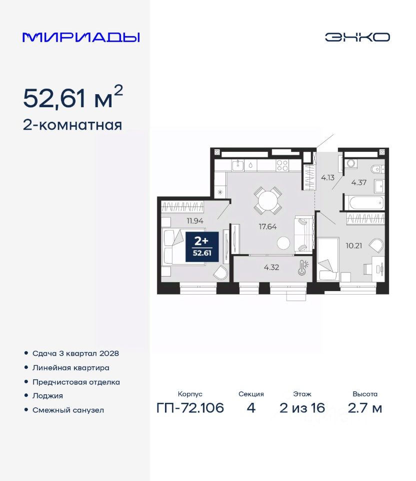 Торопитесь забронировать по этой цене! Предложение ограничено! Стоимость квартиры указана со скидкой, ваша экономия составит 382,000 RUB. Информация по телефону, мы вам все подробно расскажем! 2-комн. квартира от застройщика с предчистовой отделкой в ЖК ''Мириады'' на 11 этаже. Общая площадь: 52.61 кв.м., жилая: 22.15 кв.м., площадь просторной кухни-столовой: 17.64 кв.м. Комнаты изолированные, все окна выходят на одну сторону. В квартире одна лоджия, один совмещенный санузел. Высота потолков 2.7 м. Дом монолитный, черырехподъездный, переменной этажности, от 13 до 16 этажей. Квартира находится в 4-й секции высотой 16 этажей в корпусе ГП-72.106. На этаже 6 квартир. В подъезде 1 пассажирский и 1 грузовой лифт. Окончание строительства - 3 квартал 2028 года. Оформление сделки по договору долевого участия. Вселенная бесконечных историй. Ранее невиданный Тюмени масштаб: территория 240 гектаров и 1 650 000 м² застройки. Мириады это город масштабных перемен и больших возможностей. Город зеленых рощ и зеркальных озер. Город для работы, учебы и развлечений. Город для детей и их родителей. Город для всех и каждого. Проект расположен в районе Мыс рядом с ТРЦ ''Тюмень Сити Молл'' в границах улицы Тимофея Чаркова, Тобольского тракта и объездной дороги. Срок полного освоения территории - до 2034 года. #ZMDaZi