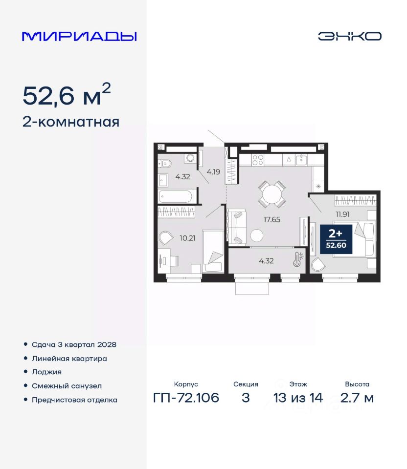 Торопитесь оформить бронирование на этих условиях! Предложение ограничено! Стоимость квартиры указана со скидкой, ваша экономия составит 382,500 RUB. По всем вопросам звоните в офис продаж, наши менеджеры вам все расскажут! Продается двухкомнатная квартира с предчистовой отделкой в ЖК ''Мириады'' на 13 этаже. Общая площадь: 52.6 кв.м., жилая: 22.12 кв.м., площадь просторной кухни-столовой: 17.65 кв.м. Комнаты изолированные, все окна выходят на одну сторону. В квартире одна лоджия, один совмещенный санузел. Высота потолков 2.7 м. Дом монолитный, черырехподъездный, переменной этажности, от 13 до 16 этажей. Квартира находится в 3-й секции высотой 14 этажей в корпусе ГП-72.106. На этаже 6 квартир. В подъезде 1 пассажирский и 1 грузовой лифт. Окончание строительства - 3 квартал 2028 года. Оформление сделки по договору долевого участия. Вселенная бесконечных историй. Ранее невиданный Тюмени масштаб: территория 240 гектаров и 1 650 000 м² застройки. Мириады это город масштабных перемен и больших возможностей. Город зеленых рощ и зеркальных озер. Город для работы, учебы и развлечений. Город для детей и их родителей. Город для всех и каждого. Проект расположен в районе Мыс рядом с ТРЦ ''Тюмень Сити Молл'' в границах улицы Тимофея Чаркова, Тобольского тракта и объездной дороги. Срок полного освоения территории - до 2034 года. #ZmDAZ2
