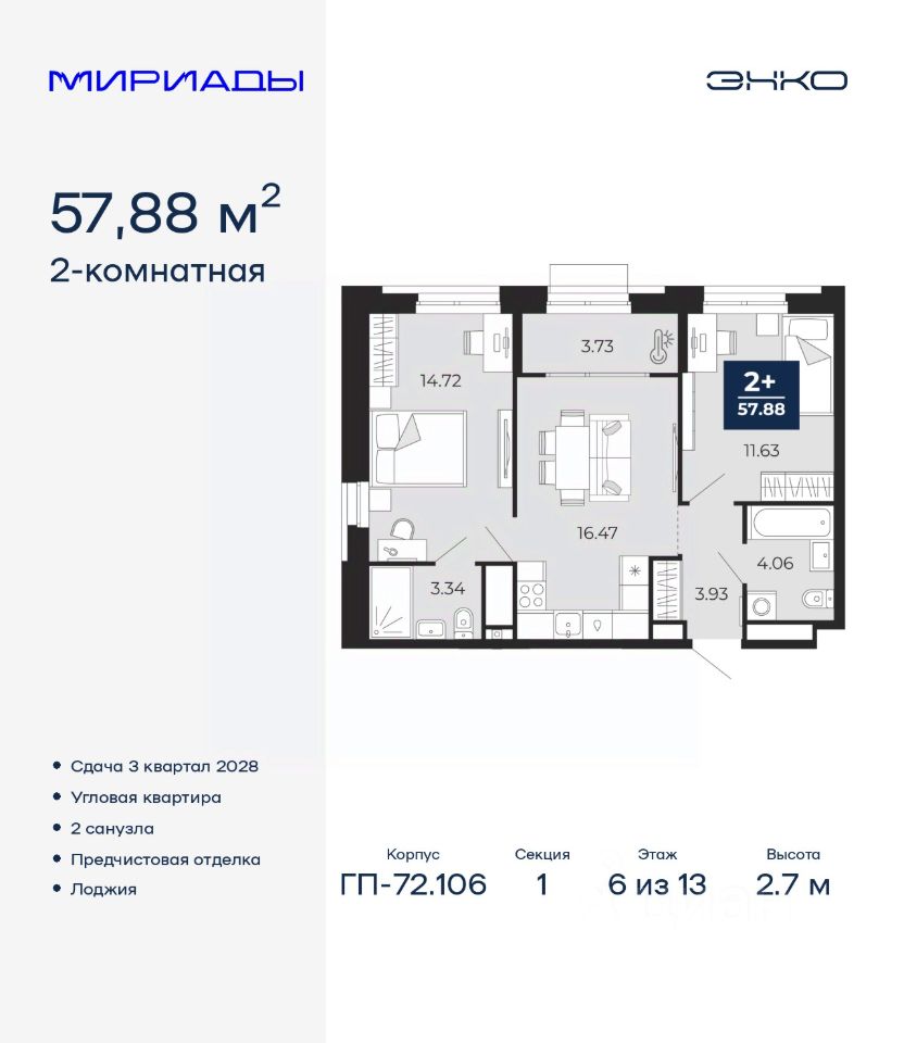 Торопитесь оформить бронирование, пока действует скидка! Предложение ограничено! Стоимость квартиры указана со скидкой, ваша экономия составит 395,000 RUB. По всем вопросам обращайтесь в офис продаж, наши менеджеры вам все расскажут! 2-комн. квартира с предчистовой отделкой в ЖК ''Мириады'' на 6 этаже. Общая площадь: 57.88 кв.м., жилая: 26.35 кв.м., площадь просторной кухни-столовой: 16.47 кв.м. Квартира угловая, окна oбecпeчивaют paвнoмepнoe ocвeщeниe в тeчeниe дня. В квартире одна лоджия, два совмещенных санузла. Высота потолков 2.7 м. Дом монолитный, черырехподъездный, переменной этажности, от 13 до 16 этажей. Квартира находится в 1-й секции высотой 13 этажей в корпусе ГП-72.106. На этаже 5 квартир. В подъезде 1 пассажирский и 1 грузовой лифт. Окончание строительства - 3 квартал 2028 года. Оформление сделки по договору долевого участия. Вселенная бесконечных историй. Ранее невиданный Тюмени масштаб: территория 240 гектаров и 1 650 000 м² застройки. Мириады это город масштабных перемен и больших возможностей. Город зеленых рощ и зеркальных озер. Город для работы, учебы и развлечений. Город для детей и их родителей. Город для всех и каждого. Проект расположен в районе Мыс рядом с ТРЦ ''Тюмень Сити Молл'' в границах улицы Тимофея Чаркова, Тобольского тракта и объездной дороги. Срок полного освоения территории - до 2034 года. #26dAUZ