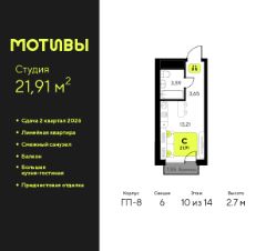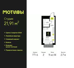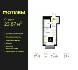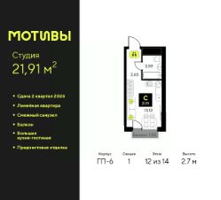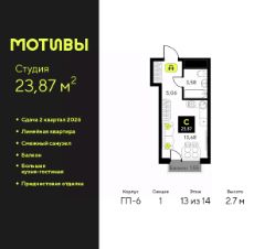 Продается 1-комн. квартира-студия от застройщика с предчистовой отделкой в ЖК ''Мотивы'' на 13 этаже. Общая площадь: 24.95 кв.м., площадь гостиной 14.02 кв.м., из которых 5 кв.м. выделено под кухонную зону. Все окна выходят на одну сторону. В квартире один балкон, один совмещенный санузел. Высота потолков 2.7 м. Квартира будет сдаваться с предчистовой отделкой White Box: выровнены и оштукатурены стены, проведено электричество и отопление, установлены радиаторы. Вы также можете приобрести квартиру с ремонтом от застройщика, представленным в трех цветовых решениях Scandi, Wood и Coffee и включающим ламинат, обои под покраску, двери, натяжной потолок и санузел с сантехникой. При желании вы можете заказать отделку под ключ, варианты возможных решений представлены в альбоме фотографий. Дом монолитный, черырехподъездный, переменной этажности, от 12 до 14 этажей. Квартира находится во 2-й секции высотой 14 этажей в корпусе ГП-6. На этаже 12 квартир. В подъезде 1 пассажирский и 1 грузовой лифт. Окончание строительства - 2 квартал 2026 года. Оформление сделки по договору долевого участия. Закрытая от автомобилей территория, безопасный двор и камеры видеонаблюдения - гаранты вашего спокойствия. Квартал будет располагать богатой инфраструктурой: на первых этажах разместятся магазины, пекарни, кофейни, пункты выдачи, аптеки, детские центры, цветочные салоны и многое другое, что сделает жизнь поистине комфортной. Рядом находится парк общей площадью почти 5000 м², в котором располагаются локации для игр и отдыха жителей, здесь можно совершить утреннюю пробежку или прогуляться после рабочего дня. В парке есть зона воркаута с тренажерами для взрослых, игровые комплексы с горками и канатный комплекс для детей разных возрастов, качели и лавочки для отдыха, площадки для командных видов спорта и для панна-футбола. В ЖК ''Мотивы'' всё продумано до мелочей: светлые холлы входных групп, оформленные в едином стиле, просторные колясочные, лапомойки для питомцев. На территории комплекса находятся 2 8-ми этажных паркинга и более 1000 м/м на открытой парковке. Жилой комплекс находится в одном из экологически благоприятных районов Тюмени, недалеко от Плехановского бора. При этом до центра города можно добраться за 15 минут, а до международного аэропорта Рощино за 13 минут. Окончание строительства: ГП 1, 2, 3, 4 сдача до конца 2024 года, ГП 6, 7, 8 сдача 2 квартал 2026 года. #24ATbI