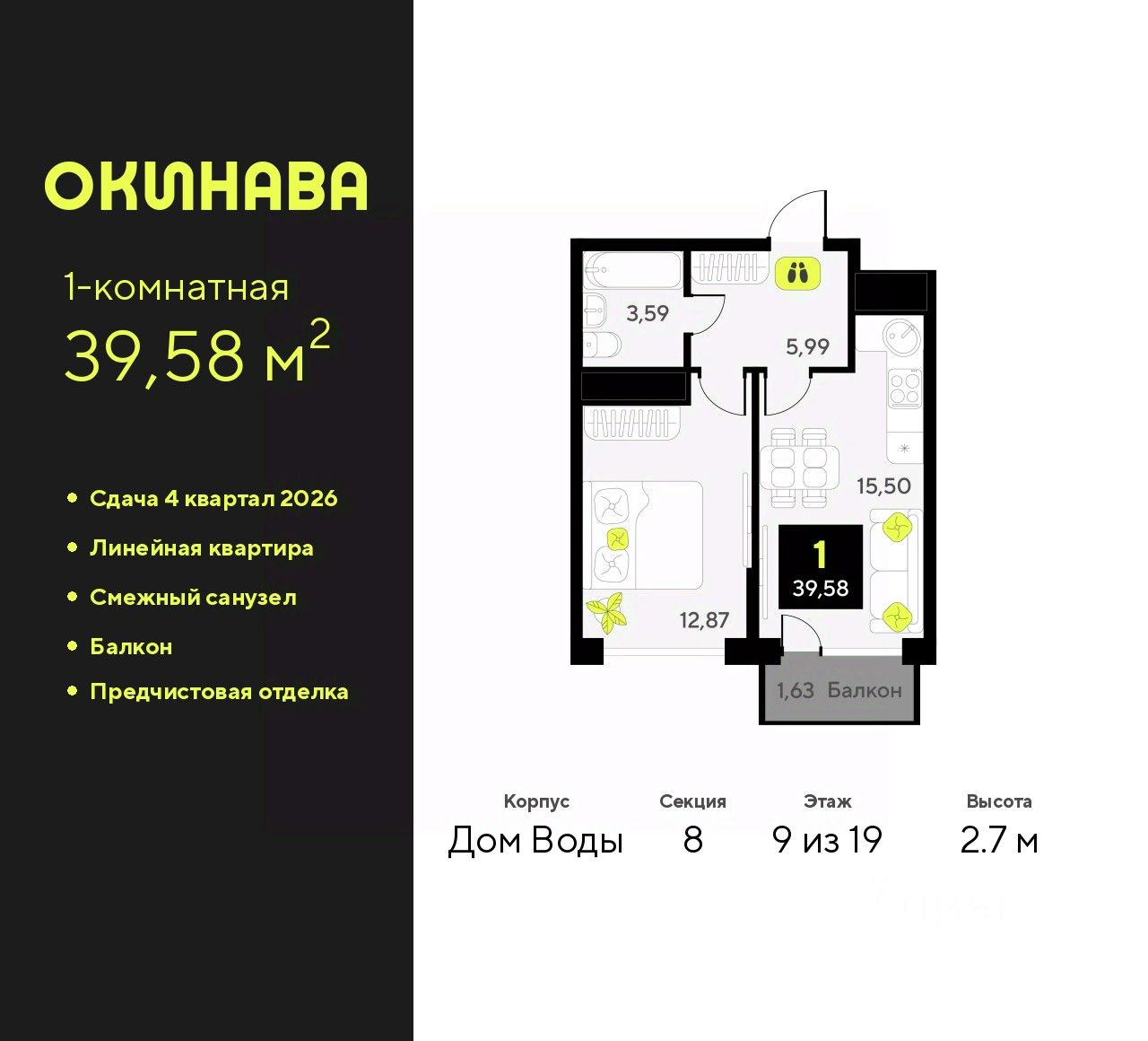 Продается 1-комн. квартира с предчистовой отделкой в ЖК ''Окинава'' на 2 этаже. Общая площадь: 38.85 кв.м., жилая: 12.66 кв.м., площадь просторной кухни-столовой: 14.47 кв.м. Все окна выходят на одну сторону. В квартире один совмещенный санузел. Высота потолков 2.7 м. Квартира будет сдана с предчистовой отделкой: на полах стяжка под финишное покрытие, стены подготовлены под покраску или оклейку обоями, разведена вся электрика с подготовкой для установки выключателей и освещения. При желании вы можете заказать отделку под ключ, варианты возможных решений представлены в альбоме фотографий. Дом монолитный, многоподъездный, переменной этажности, от 13 до 19 этажей. Квартира находится во 2-й секции высотой 13 этажей в корпусе Дом Огня. На этаже 5 квартир. В подъезде 1 пассажирский и 1 грузовой лифт. Окончание строительства - 3 квартал 2027 года. Оформление сделки по договору долевого участия. ЖК ''Окинава'' это не просто жилой комплекс, это остров 4 стихий. Они отражаются во внешнем виде фасадов домов, обустройстве дворов и внутреннем оформлении холлов. Каждая из стихий это отдельный дом. Между домами раскинется большой двухуровневый пешеходный бульвар. Первый уровень прогулочный с местами для отдыха, амфитеатром и фонтанами. На втором уровне расположатся площадки для детей, спортивных игр и тренировок. Квартал будет располагать богатой инфраструктурой: на первых этажах разместятся магазины, пекарни, кофейни, пункты выдачи, аптеки, детские центры, цветочные салоны и многое другое, что сделает жизнь поистине комфортной. В жилом комплексе есть кладовые, а также несколько видов паркинга: уличный гостевой, закрытый теплый и паркинг в стилобате, попасть в который можно на лифте с любого жилого этажа. Дворы в каждом доме отражают его стихию, отличаясь по наполнению. Они дополняют друг друга, образуя единое дворовое пространство жилого комплекса. Закрытая территория, свободная от автомобилей, обеспечит безопасность и спокойный отдых. Холлы оформлены керамогранитом, зеркалами и разноуровневым освещением. Витражные входные группы, мягкие зоны ожидания, видеонаблюдение 24/7, вместительные колясочные и даже лапомойки для питомцев всё это будет в ЖК ''Окинава''. Жилой комплекс ''Окинава'' находится в активно развивающемся V заречном микрорайоне, недалеко от озера Алебашево, где в будущем расположится масштабный ивент-парк с зонами отдыха. Удобная транспортная развязка позволит добраться до центра всего за 15 минут. #2WeIge