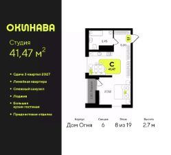 Продается 1-комн. квартира-студия с предчистовой отделкой в ЖК ''Окинава'' на 9 этаже. Общая площадь: 29.81 кв.м., площадь гостиной 18.08 кв.м., из которых 5 кв.м. выделено под кухонную зону. Все окна выходят на одну сторону. В квартире одна лоджия, один совмещенный санузел. Высота потолков 2.7 м. Квартира будет сдана с предчистовой отделкой: на полах стяжка под финишное покрытие, стены подготовлены под покраску или оклейку обоями, разведена вся электрика с подготовкой для установки выключателей и освещения. При желании вы можете заказать отделку под ключ, варианты возможных решений представлены в альбоме фотографий. Дом монолитный, многоподъездный, переменной этажности, от 13 до 19 этажей. Квартира находится в 7-й секции высотой 17 этажей в корпусе Дом Огня. На этаже 8 квартир. В подъезде 1 пассажирский и 1 грузовой лифт. Окончание строительства - 3 квартал 2027 года. Оформление сделки по договору долевого участия. ЖК ''Окинава'' это не просто жилой комплекс, это остров 4 стихий. Они отражаются во внешнем виде фасадов домов, обустройстве дворов и внутреннем оформлении холлов. Каждая из стихий это отдельный дом. Между домами раскинется большой двухуровневый пешеходный бульвар. Первый уровень прогулочный с местами для отдыха, амфитеатром и фонтанами. На втором уровне расположатся площадки для детей, спортивных игр и тренировок. Квартал будет располагать богатой инфраструктурой: на первых этажах разместятся магазины, пекарни, кофейни, пункты выдачи, аптеки, детские центры, цветочные салоны и многое другое, что сделает жизнь поистине комфортной. В жилом комплексе есть кладовые, а также несколько видов паркинга: уличный гостевой, закрытый теплый и паркинг в стилобате, попасть в который можно на лифте с любого жилого этажа. Дворы в каждом доме отражают его стихию, отличаясь по наполнению. Они дополняют друг друга, образуя единое дворовое пространство жилого комплекса. Закрытая территория, свободная от автомобилей, обеспечит безопасность и спокойный отдых. Холлы оформлены керамогранитом, зеркалами и разноуровневым освещением. Витражные входные группы, мягкие зоны ожидания, видеонаблюдение 24/7, вместительные колясочные и даже лапомойки для питомцев всё это будет в ЖК ''Окинава''. Жилой комплекс ''Окинава'' находится в активно развивающемся V заречном микрорайоне, недалеко от озера Алебашево, где в будущем расположится масштабный ивент-парк с зонами отдыха. Удобная транспортная развязка позволит добраться до центра всего за 15 минут. #zweIuZ
