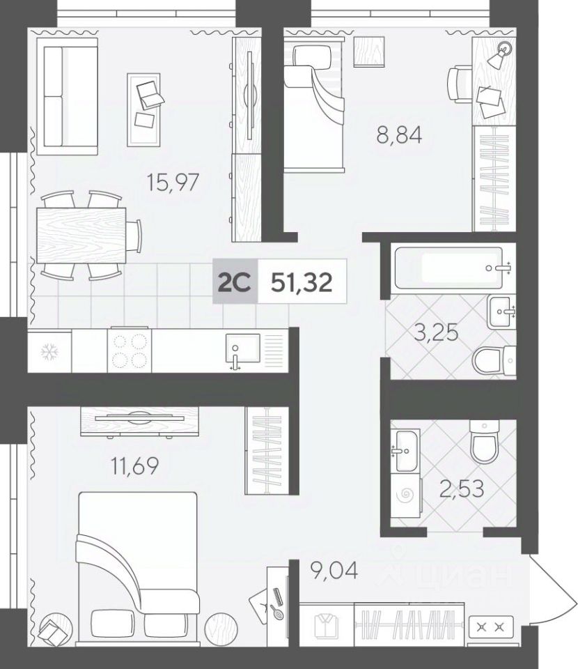 Продаётся 2-комнатная квартира в строящемся доме (ГП 2 (Сергея Корепанова, 34)), срок сдачи: IV-кв. 2027, общей площадью 51.32 кв.м., на 12 этаже. Новый жилой комплекс ''Скандиа. Квартал у Леса'' от Специализированного застройщика ''СКАНДИА У ЛЕСА'' расположен в г. Тюмень на ул. Бориса Прудаева.
