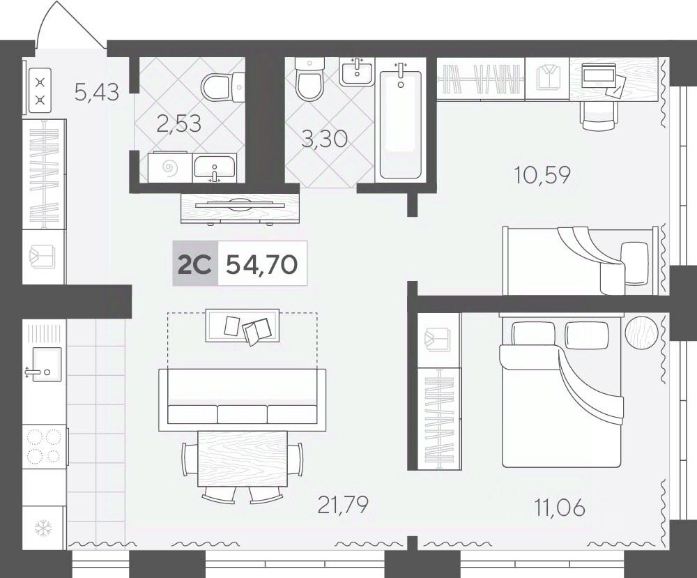Продаётся 2-комнатная квартира в строящемся доме (ГП 2 (Сергея Корепанова, 34)), срок сдачи: IV-кв. 2027, общей площадью 54.7 кв.м., на 3 этаже. Новый жилой комплекс ''Скандиа. Квартал у Леса'' от Специализированного застройщика ''СКАНДИА У ЛЕСА'' расположен в г. Тюмень на ул. Бориса Прудаева.