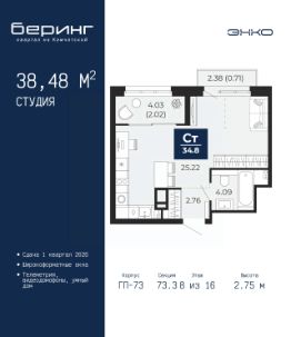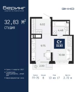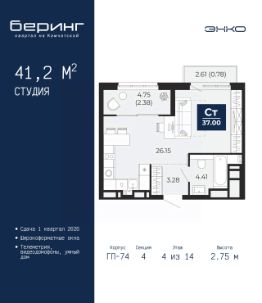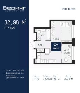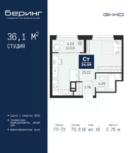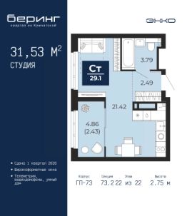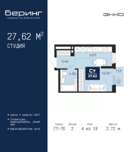 Торопитесь забронировать по этой цене, предложение ограничено! Стоимость квартиры указана со скидкой, ваша экономия составит 220,764 руб. Звоните, наши менеджеры вам все расскажут. Просторная 1-комн. квартира-студия в ЖК ''Беринг'' на 4 этаже. Общая площадь: 27.62 кв.м. Высота потолков 2.72 м. Дом монолитный, черырехподъездный, переменной этажности, от 19 до 24 этажей. Квартира находится во 2-й секции высотой 19 этажей в корпусе ГП-76. На этаже 8 квартир. В подъезде 1 пассажирский и 1 грузовой лифт. Окончание строительства - 4 квартал 2027 года. Оформление сделки по договору долевого участия. Подобно знаменитому исследователю, мы чувствуем себя первооткрывателями этой локации. Хотим показать новую суть места, сформировать для вас жизненный опыт, которого ещё не было. Беринг — район зелёного цвета. Беринг — район, который откроется вам с другой стороны. Впечатлит новым уровнем комфорта и качеством жизни. Беринг — открытие на карте города. Первый квартал расположен в районе Тура, в границах улиц: Камчатская Западносибирская Энтузиастов. Вокруг уже есть всё для того, чтобы ежедневная рутина была лишь частью жизни и не доставляла дискомфорта.Школы и детские сады, магазины и аптеки, поликлиника, места для семейного отдыха, пеших и велопрогулок, и даже рыбалки. Масштабное озеленение дворов — визитная карточка ЭНКО и ваш оазис спокойствия, чтобы отвлечься от повседневности. Раскидистые деревья, кустарники, травы и цветы — осталось остановиться, вдохнуть и расслабиться, глядя на эту природную красоту. Стилистика подъездов продолжает концепцию Беринга, вдохновлённого Камчаткой: сдержанный,но при этом впечатляющий дизайн соседствует с удобством и функциональностью. #zmddul