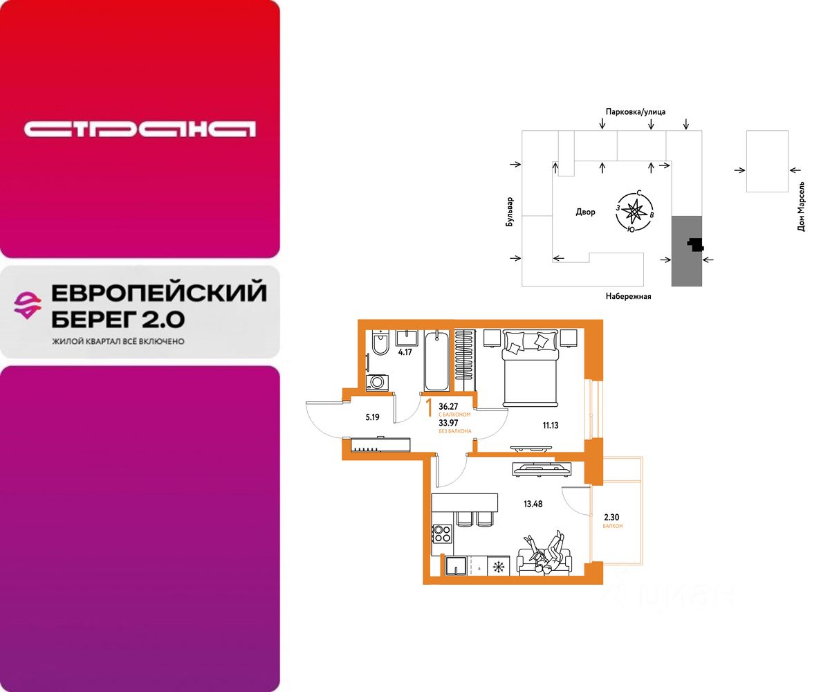Объявление от застройщика Страна Девелопмент. Покупка квартиры защищена банком. Продается 1комнатная квартира на 3 этаже от застройщика Страна Девелопмент. Площадь квартиры 36,27 кв. м. Стоимость указана без учета акций. Европейский берег 2.0. — это продолжение легендарного жилого комплекса Европейский берег. Он включает все, что нужно для жизни, и даже больше. Этот квартал для тех, кто не готов тратить время на ненужное, жертвовать одним ради другого. Для тех, кто хочет получить все и сразу. Именно поэтому генеральная идея проекта — жилой квартал все включено. Все преимущества включены. Никаких исключений. ПРЕИМУЩЕСТВА Разнообразие планировок: от классических до квартир с мастер-спальней и террасами. Подземный паркинг с кладовыми, охраной и видеонаблюдением 24/7. Ремонт от застройщика: 5 вариантов на выбор. Закрытый двор с площадками и зонами отдыха: мост-акведук, тренажёры, лабиринты, гамаки и шезлонги. ОТДЕЛКА Базовая отделка или готовый ремонт от застройщика. В базовой отделке все черновые работы выполнены, подведены коммуникации, стены оштукатурены под маяк. В ремонт от застройщика входит 5 вариантов отделки, уже включено всё необходимое: от сантехники до кондиционера. СПОСОБЫ ПОКУПКИ Сотрудники ''Страны Девелопмент'' будут сопровождать вас на каждом этапе сделки, помогут получить одобрение по ипотеке или снизить ежемесячный платеж. - ипотека - материнский капитал - 100% оплата наличными - рассрочка - обмен — это выкуп вашей старой квартиры и зачисление полученных денежных средств в счет стоимости новой квартиры или в качестве первоначального взноса по ипотеке.