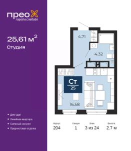 Однокомнатная квартира-студия от застройщика с предчистовой отделкой в ЖК ''Мотивы'' на 14 этаже. Общая площадь: 24.95 кв.м., площадь гостиной 14.02 кв.м., из которых 5 кв.м. выделено под кухонную зону. Все окна выходят на одну сторону. В квартире один балкон, один совмещенный санузел. Высота потолков 2.7 м. Квартира будет сдаваться с предчистовой отделкой White Box: выровнены и оштукатурены стены, проведено электричество и отопление, установлены радиаторы. Вы также можете приобрести квартиру с ремонтом от застройщика, представленным в трех цветовых решениях Scandi, Wood и Coffee и включающим ламинат, обои под покраску, двери, натяжной потолок и санузел с сантехникой. При желании вы можете заказать отделку под ключ, варианты возможных решений представлены в альбоме фотографий. Дом монолитный, черырехподъездный, переменной этажности, от 12 до 14 этажей. Квартира находится во 2-й секции высотой 14 этажей в корпусе ГП-6. На этаже 12 квартир. В подъезде 1 пассажирский и 1 грузовой лифт. Окончание строительства - 2 квартал 2026 года. Оформление сделки по договору долевого участия. Закрытая от автомобилей территория, безопасный двор и камеры видеонаблюдения - гаранты вашего спокойствия. Квартал будет располагать богатой инфраструктурой: на первых этажах разместятся магазины, пекарни, кофейни, пункты выдачи, аптеки, детские центры, цветочные салоны и многое другое, что сделает жизнь поистине комфортной. Рядом находится парк общей площадью почти 5000 м², в котором располагаются локации для игр и отдыха жителей, здесь можно совершить утреннюю пробежку или прогуляться после рабочего дня. В парке есть зона воркаута с тренажерами для взрослых, игровые комплексы с горками и канатный комплекс для детей разных возрастов, качели и лавочки для отдыха, площадки для командных видов спорта и для панна-футбола. В ЖК ''Мотивы'' всё продумано до мелочей: светлые холлы входных групп, оформленные в едином стиле, просторные колясочные, лапомойки для питомцев. На территории комплекса находятся 2 8-ми этажных паркинга и более 1000 м/м на открытой парковке. Жилой комплекс находится в одном из экологически благоприятных районов Тюмени, недалеко от Плехановского бора. При этом до центра города можно добраться за 15 минут, а до международного аэропорта Рощино за 13 минут. Окончание строительства: ГП 1, 2, 3, 4 сдача до конца 2024 года, ГП 6, 7, 8 сдача 2 квартал 2026 года. #26d2oE
