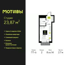 Продается однокомнатная квартира-студия с предчистовой отделкой в ЖК ''Мотивы'' на 8 этаже. Общая площадь: 23.87 кв.м., площадь гостиной 13.68 кв.м., из которых 5 кв.м. выделено под кухонную зону. Все окна выходят на одну сторону. В квартире один балкон, один совмещенный санузел. Высота потолков 2.7 м. Квартира будет сдаваться с предчистовой отделкой White Box: выровнены и оштукатурены стены, проведено электричество и отопление, установлены радиаторы. Вы также можете приобрести квартиру с ремонтом от застройщика, представленным в трех цветовых решениях Scandi, Wood и Coffee и включающим ламинат, обои под покраску, двери, натяжной потолок и санузел с сантехникой. При желании вы можете заказать отделку под ключ, варианты возможных решений представлены в альбоме фотографий. Дом монолитный, черырехподъездный, переменной этажности, от 12 до 14 этажей. Квартира находится во 2-й секции высотой 14 этажей в корпусе ГП-6. На этаже 12 квартир. В подъезде 1 пассажирский и 1 грузовой лифт. Окончание строительства - 2 квартал 2026 года. Оформление сделки по договору долевого участия. Закрытая от автомобилей территория, безопасный двор и камеры видеонаблюдения - гаранты вашего спокойствия. Квартал будет располагать богатой инфраструктурой: на первых этажах разместятся магазины, пекарни, кофейни, пункты выдачи, аптеки, детские центры, цветочные салоны и многое другое, что сделает жизнь поистине комфортной. Рядом находится парк общей площадью почти 5000 м², в котором располагаются локации для игр и отдыха жителей, здесь можно совершить утреннюю пробежку или прогуляться после рабочего дня. В парке есть зона воркаута с тренажерами для взрослых, игровые комплексы с горками и канатный комплекс для детей разных возрастов, качели и лавочки для отдыха, площадки для командных видов спорта и для панна-футбола. В ЖК ''Мотивы'' всё продумано до мелочей: светлые холлы входных групп, оформленные в едином стиле, просторные колясочные, лапомойки для питомцев. На территории комплекса находятся 2 8-ми этажных паркинга и более 1000 м/м на открытой парковке. Жилой комплекс находится в одном из экологически благоприятных районов Тюмени, недалеко от Плехановского бора. При этом до центра города можно добраться за 15 минут, а до международного аэропорта Рощино за 13 минут. Окончание строительства: ГП 1, 2, 3, 4 сдача до конца 2024 года, ГП 6, 7, 8 сдача 2 квартал 2026 года. #Z6dzO7