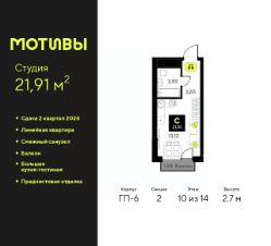 Однокомнатная квартира-студия от застройщика с предчистовой отделкой в ЖК ''Мотивы'' на 10 этаже. Общая площадь: 21.91 кв.м., площадь гостиной 13.21 кв.м., из которых 5 кв.м. выделено под кухонную зону. Все окна выходят на одну сторону. В квартире один балкон, один совмещенный санузел. Высота потолков 2.7 м. Квартира будет сдаваться с предчистовой отделкой White Box: выровнены и оштукатурены стены, проведено электричество и отопление, установлены радиаторы. Вы также можете приобрести квартиру с ремонтом от застройщика, представленным в трех цветовых решениях Scandi, Wood и Coffee и включающим ламинат, обои под покраску, двери, натяжной потолок и санузел с сантехникой. При желании вы можете заказать отделку под ключ, варианты возможных решений представлены в альбоме фотографий. Дом монолитный, черырехподъездный, переменной этажности, от 12 до 14 этажей. Квартира находится во 2-й секции высотой 14 этажей в корпусе ГП-6. На этаже 12 квартир. В подъезде 1 пассажирский и 1 грузовой лифт. Окончание строительства - 2 квартал 2026 года. Оформление сделки по договору долевого участия. Закрытая от автомобилей территория, безопасный двор и камеры видеонаблюдения - гаранты вашего спокойствия. Квартал будет располагать богатой инфраструктурой: на первых этажах разместятся магазины, пекарни, кофейни, пункты выдачи, аптеки, детские центры, цветочные салоны и многое другое, что сделает жизнь поистине комфортной. Рядом находится парк общей площадью почти 5000 м², в котором располагаются локации для игр и отдыха жителей, здесь можно совершить утреннюю пробежку или прогуляться после рабочего дня. В парке есть зона воркаута с тренажерами для взрослых, игровые комплексы с горками и канатный комплекс для детей разных возрастов, качели и лавочки для отдыха, площадки для командных видов спорта и для панна-футбола. В ЖК ''Мотивы'' всё продумано до мелочей: светлые холлы входных групп, оформленные в едином стиле, просторные колясочные, лапомойки для питомцев. На территории комплекса находятся 2 8-ми этажных паркинга и более 1000 м/м на открытой парковке. Жилой комплекс находится в одном из экологически благоприятных районов Тюмени, недалеко от Плехановского бора. При этом до центра города можно добраться за 15 минут, а до международного аэропорта Рощино за 13 минут. Окончание строительства: ГП 1, 2, 3, 4 сдача до конца 2024 года, ГП 6, 7, 8 сдача 2 квартал 2026 года. #Zmd2Ob