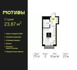 Продается однокомнатная квартира-студия с предчистовой отделкой в ЖК ''Мотивы'' на 14 этаже. Общая площадь: 23.87 кв.м., площадь гостиной 13.68 кв.м., из которых 5 кв.м. выделено под кухонную зону. Все окна выходят на одну сторону. В квартире один балкон, один совмещенный санузел. Высота потолков 2.7 м. Квартира будет сдаваться с предчистовой отделкой White Box: выровнены и оштукатурены стены, проведено электричество и отопление, установлены радиаторы. Вы также можете приобрести квартиру с ремонтом от застройщика, представленным в трех цветовых решениях Scandi, Wood и Coffee и включающим ламинат, обои под покраску, двери, натяжной потолок и санузел с сантехникой. При желании вы можете заказать отделку под ключ, варианты возможных решений представлены в альбоме фотографий. Дом монолитный, черырехподъездный, переменной этажности, от 12 до 14 этажей. Квартира находится во 2-й секции высотой 14 этажей в корпусе ГП-6. На этаже 12 квартир. В подъезде 1 пассажирский и 1 грузовой лифт. Окончание строительства - 2 квартал 2026 года. Оформление сделки по договору долевого участия. Закрытая от автомобилей территория, безопасный двор и камеры видеонаблюдения - гаранты вашего спокойствия. Квартал будет располагать богатой инфраструктурой: на первых этажах разместятся магазины, пекарни, кофейни, пункты выдачи, аптеки, детские центры, цветочные салоны и многое другое, что сделает жизнь поистине комфортной. Рядом находится парк общей площадью почти 5000 м², в котором располагаются локации для игр и отдыха жителей, здесь можно совершить утреннюю пробежку или прогуляться после рабочего дня. В парке есть зона воркаута с тренажерами для взрослых, игровые комплексы с горками и канатный комплекс для детей разных возрастов, качели и лавочки для отдыха, площадки для командных видов спорта и для панна-футбола. В ЖК ''Мотивы'' всё продумано до мелочей: светлые холлы входных групп, оформленные в едином стиле, просторные колясочные, лапомойки для питомцев. На территории комплекса находятся 2 8-ми этажных паркинга и более 1000 м/м на открытой парковке. Жилой комплекс находится в одном из экологически благоприятных районов Тюмени, недалеко от Плехановского бора. При этом до центра города можно добраться за 15 минут, а до международного аэропорта Рощино за 13 минут. Окончание строительства: ГП 1, 2, 3, 4 сдача до конца 2024 года, ГП 6, 7, 8 сдача 2 квартал 2026 года. #ZmDz0F