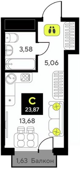 1-комн. квартира-студия с предчистовой отделкой в ЖК ''Мотивы'' на 12 этаже. Общая площадь: 23.87 кв.м., площадь гостиной 13.68 кв.м., из которых 5 кв.м. выделено под кухонную зону. Все окна выходят на одну сторону. В квартире один балкон, один совмещенный санузел. Высота потолков 2.7 м. Квартира будет сдаваться с предчистовой отделкой White Box: выровнены и оштукатурены стены, проведено электричество и отопление, установлены радиаторы. Вы также можете приобрести квартиру с ремонтом от застройщика, представленным в трех цветовых решениях Scandi, Wood и Coffee и включающим ламинат, обои под покраску, двери, натяжной потолок и санузел с сантехникой. При желании вы можете заказать отделку под ключ, варианты возможных решений представлены в альбоме фотографий. Дом монолитный, черырехподъездный, переменной этажности, от 12 до 14 этажей. Квартира находится во 2-й секции высотой 14 этажей в корпусе ГП-6. На этаже 12 квартир. В подъезде 1 пассажирский и 1 грузовой лифт. Окончание строительства - 2 квартал 2026 года. Оформление сделки по договору долевого участия. Закрытая от автомобилей территория, безопасный двор и камеры видеонаблюдения - гаранты вашего спокойствия. Квартал будет располагать богатой инфраструктурой: на первых этажах разместятся магазины, пекарни, кофейни, пункты выдачи, аптеки, детские центры, цветочные салоны и многое другое, что сделает жизнь поистине комфортной. Рядом находится парк общей площадью почти 5000 м², в котором располагаются локации для игр и отдыха жителей, здесь можно совершить утреннюю пробежку или прогуляться после рабочего дня. В парке есть зона воркаута с тренажерами для взрослых, игровые комплексы с горками и канатный комплекс для детей разных возрастов, качели и лавочки для отдыха, площадки для командных видов спорта и для панна-футбола. В ЖК ''Мотивы'' всё продумано до мелочей: светлые холлы входных групп, оформленные в едином стиле, просторные колясочные, лапомойки для питомцев. На территории комплекса находятся 2 8-ми этажных паркинга и более 1000 м/м на открытой парковке. Жилой комплекс находится в одном из экологически благоприятных районов Тюмени, недалеко от Плехановского бора. При этом до центра города можно добраться за 15 минут, а до международного аэропорта Рощино за 13 минут. Окончание строительства: ГП 1, 2, 3, 4 сдача до конца 2024 года, ГП 6, 7, 8 сдача 2 квартал 2026 года. #26Dz0c