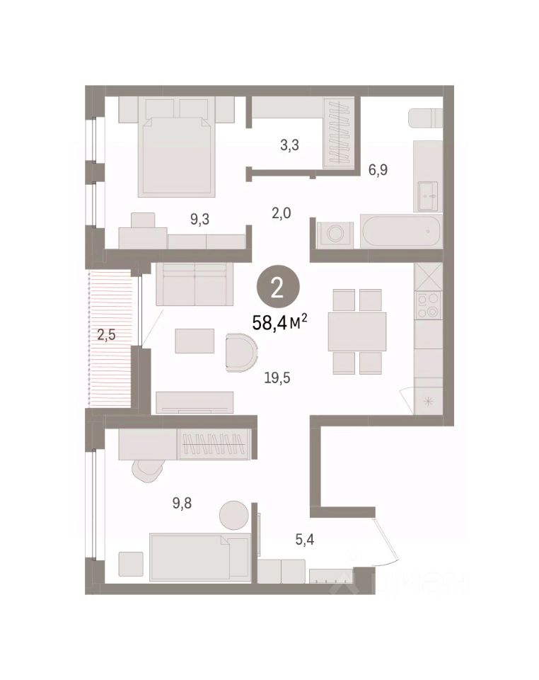 Двухкомнатная квартира от застройщика с предчистовой отделкой в ЖК ''Зарека'' на 5 этаже. Общая площадь: 58.4 кв.м. Высота потолков 2.7 м. Дом монолитный, многоподъездный, переменной этажности, от 7 до 16 этажей. Квартира находится в 4-й секции высотой 8 этажей в корпусе 2-1. На этаже 6 квартир. В подъезде 1 пассажирский и 1 грузовой лифт. Окончание строительства - 2 квартал 2029 года. Оформление сделки по договору долевого участия. Квартира с кухней-гостиной и двумя спальнями в жилом районе ''Зарека''. Особенности планировки: вид во двор, гардеробная, лоджия, предчистовая отделка, разнесённые спальни. О доме Замкнутый квартал высотой 8 этажей с 16-ти этажной башней-доминантой и двором на стилобате двухуровневого паркинга. Дом 2.1 сочетает в себе приемы классической и современной архитектуры. Выразительность достигается благодаря симметричной композиции фасада, чередование массинга идет за счет эркеров и подрезок. Фасады первых этажей выполнены из клинкерного кирпича, выше - штукатурные. Акцентом на фасаде являются металлические импосты окон, темно-серого цвета, который будет контрастировать со светлыми оттенками самого фасада. квартиры в нашей базе: ЗРК02.1-Ж4.5.1. Проект На планировочную структуру ''Зареки'' повлияла близость к автомобильному мосту Челюскинцев. Мы расположили жилые здания так, чтобы они постепенно удалялись от проезжей части. Приём напоминает лесенку: чем сильнее мост возвышается над участком застройки, тем дальше по отношению к нему стоят дома. Этот ступенчатый сдвиг позволил нам сформировать буфер между кварталами и оживлённой магистралью. Мы намерены высадить здесь высокие деревья и создать дополнительную защиту от дорожных шума и пыли. В границах нашего участка мы намерены разместить школу и два встроенных детских сада на 135 и 150 мест. Общественные пространства С севера на юг территорию будет пронизывать пешеходный бульвар. Мы мыслим это общественное пространство как главный центр притяжения. На нём будут сосредоточены основные детские игровые и спортивные зоны, места для встреч и спокойного отдыха. Он также сыграет роль мостика, ведущего к другим нашим проектам — ''Европейскому кварталу'' и ''Дому у озера''. Одна из базовых идей мастер-плана касается береговой линии. Сегодня озеленение этой территории носит стихииныи характер, а прямому доступу к Туре препятствует дамба. Мы хотим благоустроить пространства у воды и открыть их для людей. Архитекторы спроектировали систему многоярусных троп и спусков к реке, смотровые площадки и места для активного отдыха и пикников. #2mEscw