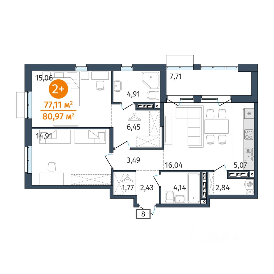 77 м² · Этаж 13 из 25