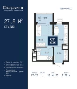 1-комн. квартира-студия с предчистовой отделкой в ЖК ''Мириады'' на 8 этаже. Общая площадь: 32.4 кв.м., площадь гостиной 23.7 кв.м., из которых 7.7 кв.м. выделено под кухонную зону. Все окна выходят на одну сторону. В квартире одна лоджия, один совмещенный санузел. Высота потолков 2.7 м. Квартира находится в корпусе ГП-72.101. Дом монолитный, одноподъездный, высотой 25 этажей. На этаже 8 квартир. В подъезде 2 пассажирских и 1 грузовой лифт. В настоящее время строительство окончено, дом сдан в 4 квартале 2025 года. Оформление сделки по договору купли-продажи. Вселенная бесконечных историй. Ранее невиданный Тюмени масштаб: территория 240 гектаров и 1 650 000 м² застройки. Мириады это город масштабных перемен и больших возможностей. Город зеленых рощ и зеркальных озер. Город для работы, учебы и развлечений. Город для детей и их родителей. Город для всех и каждого. Проект расположен в районе Мыс рядом с ТРЦ ''Тюмень Сити Молл'' в границах улицы Тимофея Чаркова, Тобольского тракта и объездной дороги. Срок полного освоения территории - до 2034 года. #ZMTDg3