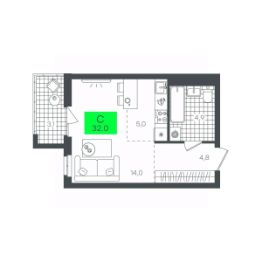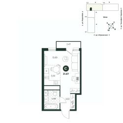 Просторная студия с французским балконом и видом на променад - отлично подойдет для молодой семьи. В комнате выделена зона под кухонный гарнитур. В прихожей достаточно места для размещения шкафа с верхней одеждой.