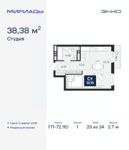 Торопитесь оформить бронирование, пока действует скидка, предложение ограничено! Стоимость квартиры указана со скидкой, ваша экономия составит 302,000 руб. Информация по телефону, наши менеджеры вам все расскажут. Продается 1-комн. квартира-студия в ЖК ''Мириады'' на 23 этаже. Общая площадь: 38.38 кв.м. Высота потолков 2.7 м. Квартира находится в корпусе ГП-72.110. Дом монолитный, одноподъездный, высотой 24 этажа. На этаже 8 квартир. В подъезде 2 пассажирских и 1 грузовой лифт. Начало строительства - 1 квартал 2026 года. Окончание строительства - 3 квартал 2028 года. Оформление сделки по договору долевого участия. Вселенная бесконечных историй. Ранее невиданный Тюмени масштаб: территория 240 гектаров и 1 650 000 м² застройки. Мириады это город масштабных перемен и больших возможностей. Город зеленых рощ и зеркальных озер. Город для работы, учебы и развлечений. Город для детей и их родителей. Город для всех и каждого. Проект расположен в районе Мыс рядом с ТРЦ ''Тюмень Сити Молл'' в границах улицы Тимофея Чаркова, Тобольского тракта и объездной дороги. Срок полного освоения территории - до 2034 года. #26ddDf