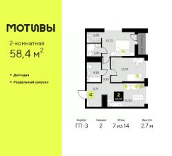 Продается 2-комн. квартира от застройщика в ЖК ''Мотивы'' на 7 этаже. Общая площадь: 58.4 кв.м. Высота потолков 2.7 м. Дом монолитный, черырехподъездный, переменной этажности, от 12 до 14 этажей. Квартира находится во 2-й секции высотой 14 этажей в корпусе ГП-3. На этаже 12 квартир. В подъезде 1 пассажирский и 1 грузовой лифт. Строительство окончено, дом сдан в 4 квартале 2024 года. Оформление сделки по договору купли-продажи. Закрытая от автомобилей территория, безопасный двор и камеры видеонаблюдения - гаранты вашего спокойствия. Квартал будет располагать богатой инфраструктурой: на первых этажах разместятся магазины, пекарни, кофейни, пункты выдачи, аптеки, детские центры, цветочные салоны и многое другое, что сделает жизнь поистине комфортной. Рядом находится парк общей площадью почти 5000 м², в котором располагаются локации для игр и отдыха жителей, здесь можно совершить утреннюю пробежку или прогуляться после рабочего дня. В парке есть зона воркаута с тренажерами для взрослых, игровые комплексы с горками и канатный комплекс для детей разных возрастов, качели и лавочки для отдыха, площадки для командных видов спорта и для панна-футбола. В ЖК ''Мотивы'' всё продумано до мелочей: светлые холлы входных групп, оформленные в едином стиле, просторные колясочные, лапомойки для питомцев. На территории комплекса находятся 2 8-ми этажных паркинга и более 1000 м/м на открытой парковке. Жилой комплекс находится в одном из экологически благоприятных районов Тюмени, недалеко от Плехановского бора. При этом до центра города можно добраться за 15 минут, а до международного аэропорта Рощино за 13 минут. Окончание строительства: ГП 1, 2, 3, 4 сдача до конца 2024 года, ГП 6, 7, 8 сдача 2 квартал 2026 года. #ZmDvmv