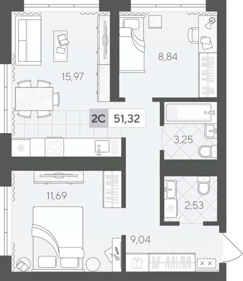 Студия отличный вариант для студентов и прогрессивной молодежи Самый популярный формат квартир! •Кухня-гостиная с двумя окнами для удобного зонирования •Просторный санузел, где вместится все необходимое •Вместительный коридор с нишей под шкаф-купе