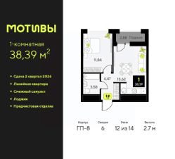 1-комн. квартира с предчистовой отделкой в ЖК ''Мотивы'' на 12 этаже. Общая площадь: 38.39 кв.м., жилая: 11.84 кв.м., площадь просторной кухни-столовой: 15.62 кв.м. Все окна выходят на одну сторону. В квартире одна лоджия, один совмещенный санузел. Высота потолков 2.7 м. Квартира будет сдаваться с предчистовой отделкой White Box: выровнены и оштукатурены стены, проведено электричество и отопление, установлены радиаторы. Вы также можете приобрести квартиру с ремонтом от застройщика, представленным в трех цветовых решениях Scandi, Wood и Coffee и включающим ламинат, обои под покраску, двери, натяжной потолок и санузел с сантехникой. При желании вы можете заказать отделку под ключ, варианты возможных решений представлены в альбоме фотографий. Дом монолитный, черырехподъездный, переменной этажности, от 12 до 14 этажей. Квартира находится в 6-й секции высотой 14 этажей в корпусе ГП-8. На этаже 12 квартир. В подъезде 1 пассажирский и 1 грузовой лифт. Окончание строительства - 2 квартал 2026 года. Оформление сделки по договору долевого участия. Закрытая от автомобилей территория, безопасный двор и камеры видеонаблюдения - гаранты вашего спокойствия. Квартал будет располагать богатой инфраструктурой: на первых этажах разместятся магазины, пекарни, кофейни, пункты выдачи, аптеки, детские центры, цветочные салоны и многое другое, что сделает жизнь поистине комфортной. Рядом находится парк общей площадью почти 5000 м², в котором располагаются локации для игр и отдыха жителей, здесь можно совершить утреннюю пробежку или прогуляться после рабочего дня. В парке есть зона воркаута с тренажерами для взрослых, игровые комплексы с горками и канатный комплекс для детей разных возрастов, качели и лавочки для отдыха, площадки для командных видов спорта и для панна-футбола. В ЖК ''Мотивы'' всё продумано до мелочей: светлые холлы входных групп, оформленные в едином стиле, просторные колясочные, лапомойки для питомцев. На территории комплекса находятся 2 8-ми этажных паркинга и более 1000 м/м на открытой парковке. Жилой комплекс находится в одном из экологически благоприятных районов Тюмени, недалеко от Плехановского бора. При этом до центра города можно добраться за 15 минут, а до международного аэропорта Рощино за 13 минут. Окончание строительства: ГП 1, 2, 3, 4 сдача до конца 2024 года, ГП 6, 7, 8 сдача 2 квартал 2026 года. #2WdbfE