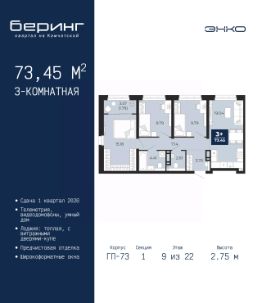 Трехкомнатная квартира от застройщика с предчистовой отделкой в ЖК ''Беринг'' на 9 этаже. Общая площадь: 73.45 кв.м., жилая: 34.76 кв.м., площадь просторной кухни-столовой: 19.04 кв.м. Квартира угловая, окна oбecпeчивaют paвнoмepнoe ocвeщeниe в тeчeниe дня. В квартире одна лоджия, один совмещенный и один раздельный санузел. Высота потолков 2.75 м. Дом монолитный, многоподъездный, переменной этажности, от 9 до 22 этажей. Квартира находится в 1-й секции высотой 22 этажа в корпусе ГП-73. На этаже 5 квартир. В подъезде 1 пассажирский и 1 грузовой лифт. Окончание строительства - 1 квартал 2026 года. Оформление сделки по договору долевого участия. Подобно знаменитому исследователю, мы чувствуем себя первооткрывателями этой локации. Хотим показать новую суть места, сформировать для вас жизненный опыт, которого ещё не было. Беринг — район зелёного цвета. Беринг — район, который откроется вам с другой стороны. Впечатлит новым уровнем комфорта и качеством жизни. Беринг — открытие на карте города. Первый квартал расположен в районе Тура, в границах улиц: Камчатская Западносибирская Энтузиастов. Вокруг уже есть всё для того, чтобы ежедневная рутина была лишь частью жизни и не доставляла дискомфорта.Школы и детские сады, магазины и аптеки, поликлиника, места для семейного отдыха, пеших и велопрогулок, и даже рыбалки. Масштабное озеленение дворов — визитная карточка ЭНКО и ваш оазис спокойствия, чтобы отвлечься от повседневности. Раскидистые деревья, кустарники, травы и цветы — осталось остановиться, вдохнуть и расслабиться, глядя на эту природную красоту. Стилистика подъездов продолжает концепцию Беринга, вдохновлённого Камчаткой: сдержанный,но при этом впечатляющий дизайн соседствует с удобством и функциональностью. #Z53t7e