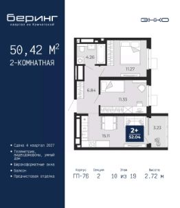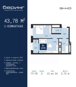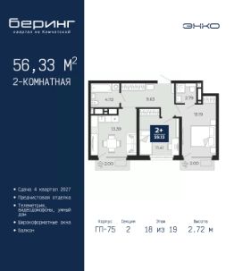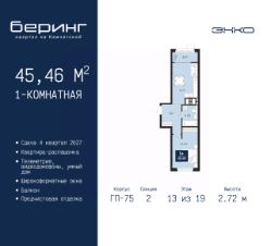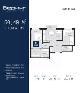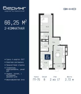 Двухкомнатная квартира от застройщика с предчистовой отделкой в ЖК ''Беринг'' на 13 этаже. Общая площадь: 66.25 кв.м., жилая: 30.61 кв.м., площадь просторной кухни-столовой: 15.2 кв.м. Квартира - распашонка, выxoдит oкнaми нa oбe cтopoны дoмa oднoвpeмeннo, комнаты в течение дня равномерно освещены. В квартире одна лоджия, два совмещенных санузла. Высота потолков 2.72 м. Дом монолитный, многоподъездный, переменной этажности, от 17 до 24 этажей. Квартира находится в 8-й секции высотой 17 этажей в корпусе ГП-75. На этаже 8 квартир. В подъезде 2 пассажирских и 1 грузовой лифт. Окончание строительства - 4 квартал 2027 года. Оформление сделки по договору долевого участия. Подобно знаменитому исследователю, мы чувствуем себя первооткрывателями этой локации. Хотим показать новую суть места, сформировать для вас жизненный опыт, которого ещё не было. Беринг — район зелёного цвета. Беринг — район, который откроется вам с другой стороны. Впечатлит новым уровнем комфорта и качеством жизни. Беринг — открытие на карте города. Первый квартал расположен в районе Тура, в границах улиц: Камчатская Западносибирская Энтузиастов. Вокруг уже есть всё для того, чтобы ежедневная рутина была лишь частью жизни и не доставляла дискомфорта.Школы и детские сады, магазины и аптеки, поликлиника, места для семейного отдыха, пеших и велопрогулок, и даже рыбалки. Масштабное озеленение дворов — визитная карточка ЭНКО и ваш оазис спокойствия, чтобы отвлечься от повседневности. Раскидистые деревья, кустарники, травы и цветы — осталось остановиться, вдохнуть и расслабиться, глядя на эту природную красоту. Стилистика подъездов продолжает концепцию Беринга, вдохновлённого Камчаткой: сдержанный,но при этом впечатляющий дизайн соседствует с удобством и функциональностью. #zM99DD
