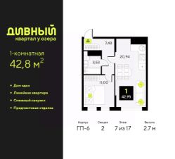 Продается 1-комн. квартира от застройщика с предчистовой отделкой в ЖК ''Дивный квартал у озера'' на 7 этаже. Общая площадь: 42.8 кв.м., жилая: 15.8 кв.м., площадь просторной кухни-столовой: 17.5 кв.м. Все окна выходят на одну сторону. В квартире один совмещенный санузел. Высота потолков 2.7 м. Квартира будет сдаваться с предчистовой отделкой White Box: выровнены и оштукатурены стены, проведено электричество и отопление, установлены радиаторы. Вы также можете приобрести квартиру с ремонтом от застройщика, представленным в трех цветовых решениях Scandi, Wood и Coffee и включающим: ламинат, обои под покраску, двери, натяжной потолок, санузел с сантехникой. При желании вы можете заказать отделку под ключ, варианты возможных решений представлены в альбоме фотографий. Дом монолитный, трехподъездный, переменной этажности, от 9 до 17 этажей. Квартира находится во 2-й секции высотой 17 этажей в корпусе ГП-6. На этаже 5 квартир. В подъезде 1 пассажирский и 1 грузовой лифт. На сегодняшний день строительство завершено, дом сдан в 4 квартале 2025 года. Оформление сделки по договору купли-продажи. ''Дивный квартал у озера'' современный жилой квартал, удобно расположенный в 10-ти минутах от центра Тюмени, в уютном районе рядом с зеленым массивом и озером Алебашево. Комплекс находится между улицами Мельникайте и Алебашевская, что обеспечивает его хорошую транспортную доступность до центра на автомобиле всего 10 минут. Рядом с комплексом расположен Лесопарк имени Гагарина, экзотический Парк дружбы между Россией и Республикой Корея. ''Дивный квартал у озера'' объединяет архитектуру современной городской застройки и природную эстетику. Уютные дворы жилого комплекса будут не только безопасными, но и тихими. Закрытая территория надёжно защищена от шума и посторонних глаз. Здесь будут места для отдыха, детские площадки, зоны для выгула собак. В холлах первого этажа расположены мягкая зона ожидания, общественные санузлы и просторная колясочная. Квартал будет располагать богатой инфраструктурой: на первых этажах домов разместятся магазины, пекарни, кофейни, пункты выдачи, аптеки, детские центры, цветочные салоны и многое другое, что сделает жизнь поистине комфортной. В комплексе есть теплый подземный паркинг и кладовые. #ZMcCeU
