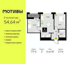 Продается 2-комн. квартира от застройщика с предчистовой отделкой в ЖК ''Мотивы'' на 6 этаже. Общая площадь: 54.64 кв.м., жилая: 23.82 кв.м., площадь просторной кухни-столовой: 19.89 кв.м. Комнаты изолированные, все окна выходят на одну сторону. В квартире одна лоджия, один совмещенный санузел. Высота потолков 2.7 м. Квартира будет сдаваться с предчистовой отделкой White Box: выровнены и оштукатурены стены, проведено электричество и отопление, установлены радиаторы. Вы также можете приобрести квартиру с ремонтом от застройщика, представленным в трех цветовых решениях Scandi, Wood и Coffee и включающим ламинат, обои под покраску, двери, натяжной потолок и санузел с сантехникой. При желании вы можете заказать отделку под ключ, варианты возможных решений представлены в альбоме фотографий. Дом монолитный, черырехподъездный, переменной этажности, от 12 до 14 этажей. Квартира находится во 2-й секции высотой 14 этажей в корпусе ГП-6. На этаже 12 квартир. В подъезде 1 пассажирский и 1 грузовой лифт. Окончание строительства - 2 квартал 2026 года. Оформление сделки по договору долевого участия. Закрытая от автомобилей территория, безопасный двор и камеры видеонаблюдения - гаранты вашего спокойствия. Квартал будет располагать богатой инфраструктурой: на первых этажах разместятся магазины, пекарни, кофейни, пункты выдачи, аптеки, детские центры, цветочные салоны и многое другое, что сделает жизнь поистине комфортной. Рядом находится парк общей площадью почти 5000 м², в котором располагаются локации для игр и отдыха жителей, здесь можно совершить утреннюю пробежку или прогуляться после рабочего дня. В парке есть зона воркаута с тренажерами для взрослых, игровые комплексы с горками и канатный комплекс для детей разных возрастов, качели и лавочки для отдыха, площадки для командных видов спорта и для панна-футбола. В ЖК ''Мотивы'' всё продумано до мелочей: светлые холлы входных групп, оформленные в едином стиле, просторные колясочные, лапомойки для питомцев. На территории комплекса находятся 2 8-ми этажных паркинга и более 1000 м/м на открытой парковке. Жилой комплекс находится в одном из экологически благоприятных районов Тюмени, недалеко от Плехановского бора. При этом до центра города можно добраться за 15 минут, а до международного аэропорта Рощино за 13 минут. Окончание строительства: ГП 1, 2, 3, 4 сдача до конца 2024 года, ГП 6, 7, 8 сдача 2 квартал 2026 года. #ZmDZOW