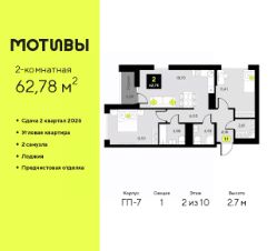 Двухкомнатная квартира от застройщика с предчистовой отделкой в ЖК ''Мотивы'' на 2 этаже. Общая площадь: 62.78 кв.м., жилая: 23.91 кв.м., площадь просторной кухни-столовой: 18.93 кв.м. Квартира угловая, окна oбecпeчивaют paвнoмepнoe ocвeщeниe в тeчeниe дня. В квартире одна лоджия, два совмещенных санузла. Высота потолков 2.7 м. Квартира будет сдаваться с предчистовой отделкой White Box: выровнены и оштукатурены стены, проведено электричество и отопление, установлены радиаторы. Вы также можете приобрести квартиру с ремонтом от застройщика, представленным в трех цветовых решениях Scandi, Wood и Coffee и включающим ламинат, обои под покраску, двери, натяжной потолок и санузел с сантехникой. При желании вы можете заказать отделку под ключ, варианты возможных решений представлены в альбоме фотографий. Дом монолитный, трехподъездный, высотой 10 этажей. Квартира находится в 1-й секции в корпусе ГП-7. На этаже 5 квартир. В подъезде 1 пассажирский и 1 грузовой лифт. Окончание строительства - 2 квартал 2026 года. Оформление сделки по договору долевого участия. Закрытая от автомобилей территория, безопасный двор и камеры видеонаблюдения - гаранты вашего спокойствия. Квартал будет располагать богатой инфраструктурой: на первых этажах разместятся магазины, пекарни, кофейни, пункты выдачи, аптеки, детские центры, цветочные салоны и многое другое, что сделает жизнь поистине комфортной. Рядом находится парк общей площадью почти 5000 м², в котором располагаются локации для игр и отдыха жителей, здесь можно совершить утреннюю пробежку или прогуляться после рабочего дня. В парке есть зона воркаута с тренажерами для взрослых, игровые комплексы с горками и канатный комплекс для детей разных возрастов, качели и лавочки для отдыха, площадки для командных видов спорта и для панна-футбола. В ЖК ''Мотивы'' всё продумано до мелочей: светлые холлы входных групп, оформленные в едином стиле, просторные колясочные, лапомойки для питомцев. На территории комплекса находятся 2 8-ми этажных паркинга и более 1000 м/м на открытой парковке. Жилой комплекс находится в одном из экологически благоприятных районов Тюмени, недалеко от Плехановского бора. При этом до центра города можно добраться за 15 минут, а до международного аэропорта Рощино за 13 минут. Окончание строительства: ГП 1, 2, 3, 4 сдача до конца 2024 года, ГП 6, 7, 8 сдача 2 квартал 2026 года. #zWddAu