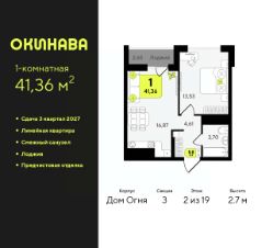Однокомнатная квартира с предчистовой отделкой в ЖК ''Окинава'' на 2 этаже. Общая площадь: 41.36 кв.м., жилая: 13.53 кв.м., площадь просторной кухни-столовой: 16.87 кв.м. Все окна выходят на одну сторону. В квартире одна лоджия, один совмещенный санузел. Высота потолков 2.7 м. Квартира будет сдана с предчистовой отделкой: на полах стяжка под финишное покрытие, стены подготовлены под покраску или оклейку обоями, разведена вся электрика с подготовкой для установки выключателей и освещения. При желании вы можете заказать отделку под ключ, варианты возможных решений представлены в альбоме фотографий. Дом монолитный, многоподъездный, переменной этажности, от 13 до 19 этажей. Квартира находится в 3-й секции высотой 19 этажей в корпусе Дом Огня. На этаже 11 квартир. В подъезде 1 пассажирский и 1 грузовой лифт. Окончание строительства - 3 квартал 2027 года. Оформление сделки по договору долевого участия. ЖК ''Окинава'' это не просто жилой комплекс, это остров 4 стихий. Они отражаются во внешнем виде фасадов домов, обустройстве дворов и внутреннем оформлении холлов. Каждая из стихий это отдельный дом. Между домами раскинется большой двухуровневый пешеходный бульвар. Первый уровень прогулочный с местами для отдыха, амфитеатром и фонтанами. На втором уровне расположатся площадки для детей, спортивных игр и тренировок. Квартал будет располагать богатой инфраструктурой: на первых этажах разместятся магазины, пекарни, кофейни, пункты выдачи, аптеки, детские центры, цветочные салоны и многое другое, что сделает жизнь поистине комфортной. В жилом комплексе есть кладовые, а также несколько видов паркинга: уличный гостевой, закрытый теплый и паркинг в стилобате, попасть в который можно на лифте с любого жилого этажа. Дворы в каждом доме отражают его стихию, отличаясь по наполнению. Они дополняют друг друга, образуя единое дворовое пространство жилого комплекса. Закрытая территория, свободная от автомобилей, обеспечит безопасность и спокойный отдых. Холлы оформлены керамогранитом, зеркалами и разноуровневым освещением. Витражные входные группы, мягкие зоны ожидания, видеонаблюдение 24/7, вместительные колясочные и даже лапомойки для питомцев всё это будет в ЖК ''Окинава''. Жилой комплекс ''Окинава'' находится в активно развивающемся V заречном микрорайоне, недалеко от озера Алебашево, где в будущем расположится масштабный ивент-парк с зонами отдыха. Удобная транспортная развязка позволит добраться до центра всего за 15 минут. #ZWE1ag