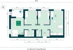 Квартира с кухней-гостиной и двумя спальнями в Октябрьском на Туре. Особенности планировки: балкон, предчистовая отделка, разнесённые спальни. квартиры в нашей базе: ОКТ-10-1-1.6.3. Район Проект расположен на берегу реки, в одном из самых живописных и экологичных районов Тюмени. За последние годы облик района изменился. По соседству с индивидуальной застройкой выросли многоквартирные дома. При проектировании ''Октябрьского на Туре'' нашей приоритетной задачей стало сохранение природного ландшафта: мы постарались деликатно вписать в него современную архитектуру. Квартал удачно расположен с точки зрения дорожной инфраструктуры. На автомобиле путь до центра города составит 15 минут. Добраться до набережной и главных тюменских достопримечательностей можно и на общественном транспорте. В пешей доступности находится автобусная остановка. Проект По мастер-плану здесь будет восемь домов. Ядро застройки составляют замкнутые кварталы переменной этажности. Их высотность понижается по мере приближения к реке. На углах участка мы разместили башни-доминанты. Одной из достопримечательностей квартала станет парк на Туре — здесь появится зеленая зона протяженностью около 6 километров для пеших и велопрогулок. Смысловая ось квартала — широкая главная улица с высаженными вдоль неё высокими деревьями. Они создают тень и работают как шумо- и пылезащитные экраны. Это место сосредоточения основных пешеходных и транспортных потоков, на сторону которых мы ориентировали большинство коммерческих помещений. Отсюда жители могут свернуть на тихие соседские улицы и попасть на внутриквартальную площадь — ещё одну точку притяжения. #23fFmS