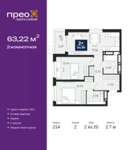 2-комн. квартира с предчистовой отделкой в ЖК ''Прео'' на 14 этаже. Общая площадь: 54.64 кв.м., жилая: 26.99 кв.м., площадь просторной кухни-столовой: 13.51 кв.м. Комнаты изолированные, все окна выходят на одну сторону. В квартире одна лоджия, один совмещенный санузел. Высота потолков 2.7 м. Дом монолитный, черырехподъездный, переменной этажности, от 14 до 21 этажей. Квартира находится во 2-й секции высотой 21 этаж в корпусе 211. На этаже 10 квартир. В подъезде 1 пассажирский и 1 грузовой лифт. Окончание строительства - 4 квартал 2026 года. Оформление сделки по договору долевого участия. Преображенский — один из самых привлекательных районов для жизни! Это полностью самостоятельный жилой район с точки зрения инфраструктуры. Преображенский находится между Московским и Червишевским трактами в квартале улиц Закалужская — Вьюжная — Александра Протозанова. Не нужно ждать, когда появится инфраструктура — переезжайте на всё готовое. Вблизи расположены действующие школа и детский сад. В этом году откроется еще один сад, а в следующем году — школа. По соседству с Преображенским запланировано строительство городского парка ''Комарово'' площадью 38 гектар. За 10 минут можно доехать на автомобиле до крупных ТРЦ: ''Лента'', ''Кристалл'', ''Леруа Мерлен'', ''Метро'' и ''Ашан''. С 2018 года в районе открыт Соседский центр — пространство, созданное для формирования добрососедской среды, совместного досуга, общения и реализации соседских инициатив. Здесь проходят встречи соседей, а также сами жители района организовывают мероприятия. Организатором такого события может стать любой желающий. В квартирах выполнена качественная предчистовая отделка. Гладкие стены с финишным выравниванием по маякам. Ровный потолок для установки натяжного потолка. Установлены пятикамерные окна с двойным стеклопакетом (3 стекла). Дизайнерские холлы с видеонаблюдением, безбарьерным и прозрачным входом всегда светло и спокойно. На первом этаже есть просторные колясочные, где все жители могут оставлять свои коляски и велосипеды. В Преображенском есть всё, что нужно для активного отдыха и занятий спортом. Мы сделали большое футбольное поле с безопасным покрытием. Также установили хоккейный корт, который оборудован по всем необходимым стандартам. Во дворах можно делать упражнения на специальных площадках с турниками. Весь район мы обустроили велодорожками, которые связаны в единый маршрут. У нас есть сухие фонтаны, бьющие из земли, деревья, веревки, сетки, скалодром, газон, песок и резинка — осталось просто дать своему ребенку право на свободную игру. По-настоящему хорошие дворы — это те, которые дети предпочитают соцсетям и телевизору. Аккредитация в банках: ПАО ''Газпромбанк'', ОАО ''Альфа-Банк'', ПАО ''Банк Уралсиб'', ''Сбербанк России'', ПАО Банк ''ВТБ'' и других. #Z5OaCf