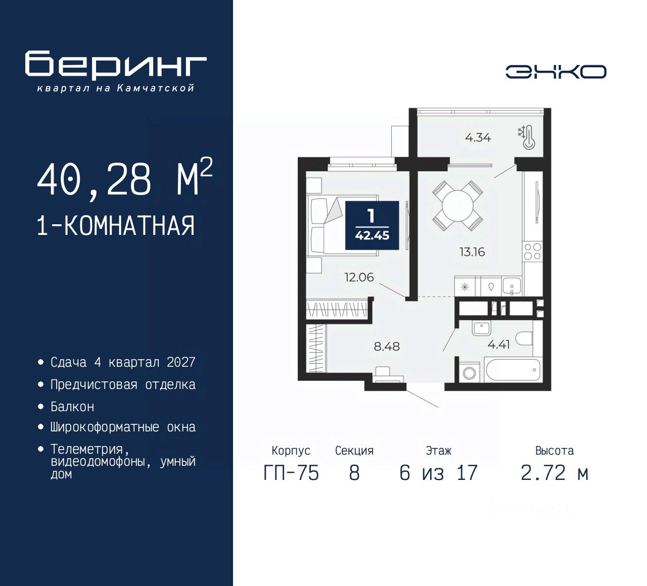 Просторная 1-комн. квартира-студия с предчистовой отделкой в ЖК ''Беринг'' на 6 этаже. Общая площадь: 31.43 кв.м., площадь гостиной 20.33 кв.м., из которых 9.75 кв.м. выделено под кухонную зону. Все окна выходят на одну сторону. В квартире один балкон, один совмещенный санузел. Высота потолков 2.72 м. Дом монолитный, многоподъездный, переменной этажности, от 17 до 24 этажей. Квартира находится в 8-й секции высотой 17 этажей в корпусе ГП-75. На этаже 8 квартир. В подъезде 2 пассажирских и 1 грузовой лифт. Окончание строительства - 4 квартал 2027 года. Оформление сделки по договору долевого участия. Подобно знаменитому исследователю, мы чувствуем себя первооткрывателями этой локации. Хотим показать новую суть места, сформировать для вас жизненный опыт, которого ещё не было. Беринг — район зелёного цвета. Беринг — район, который откроется вам с другой стороны. Впечатлит новым уровнем комфорта и качеством жизни. Беринг — открытие на карте города. Первый квартал расположен в районе Тура, в границах улиц: Камчатская Западносибирская Энтузиастов. Вокруг уже есть всё для того, чтобы ежедневная рутина была лишь частью жизни и не доставляла дискомфорта. Школы и детские сады, магазины и аптеки, поликлиника, места для семейного отдыха, пеших и велопрогулок, и даже рыбалки. Масштабное озеленение дворов — визитная карточка ЭНКО и ваш оазис спокойствия, чтобы отвлечься от повседневности. Раскидистые деревья, кустарники, травы и цветы — осталось остановиться, вдохнуть и расслабиться, глядя на эту природную красоту. Стилистика подъездов продолжает концепцию Беринга, вдохновлённого Камчаткой: сдержанный, но при этом впечатляющий дизайн соседствует с удобством и функциональностью. #z6ggou